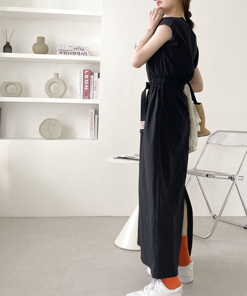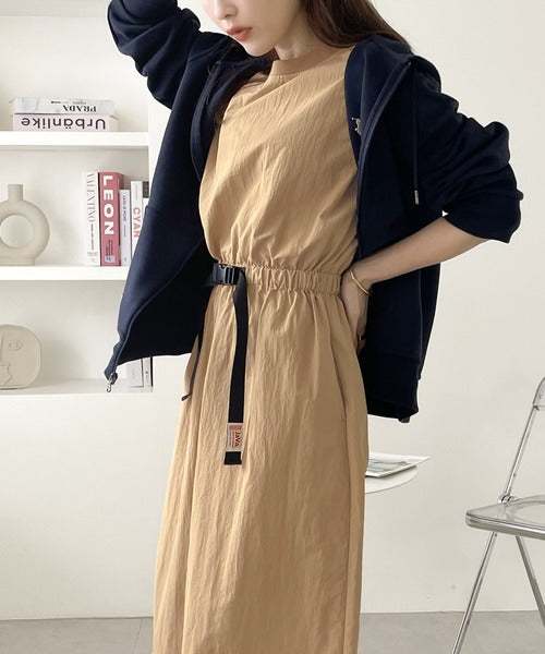 衿のリブ使いがカジュアルなロング丈ワンピース。