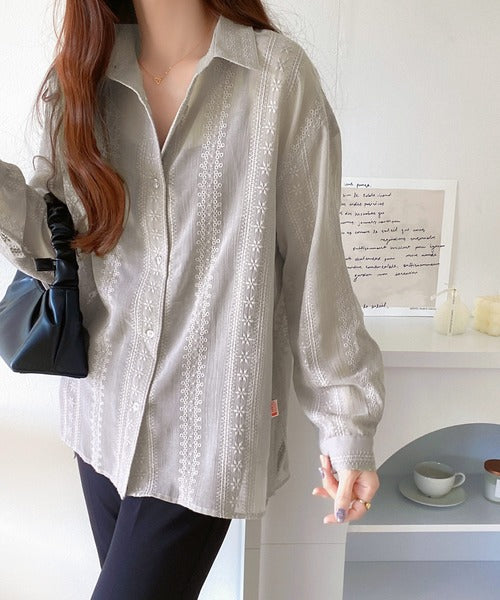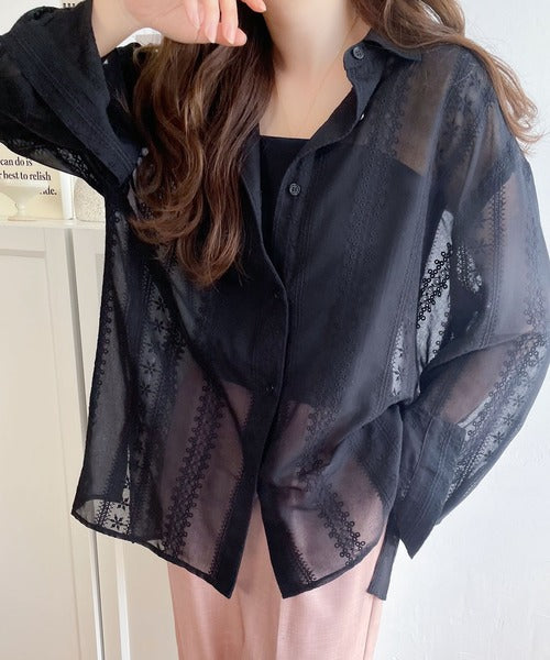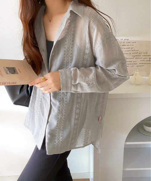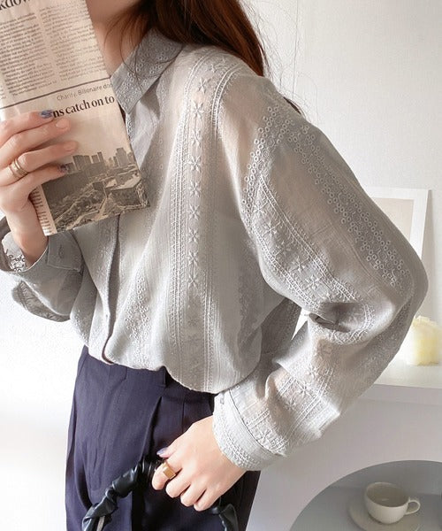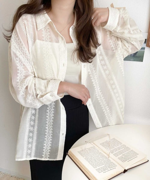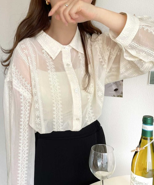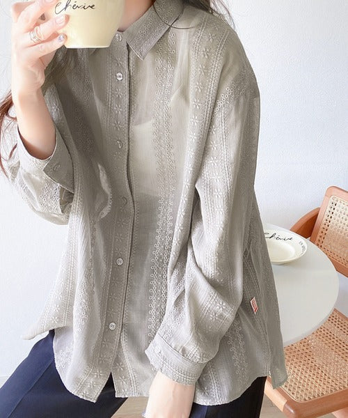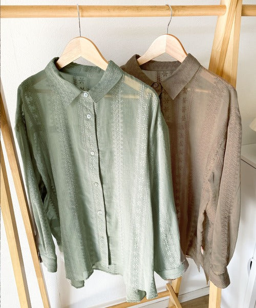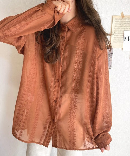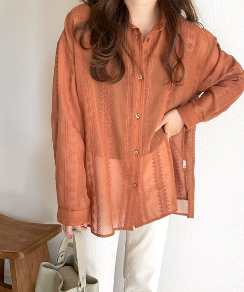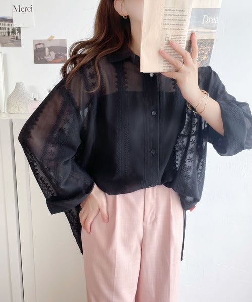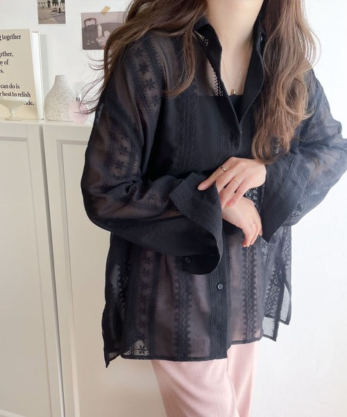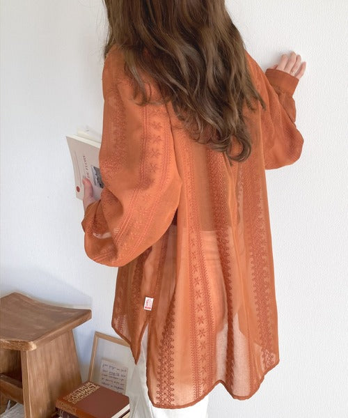 レトロな刺繍デザインが目を惹くシアーシャツ。