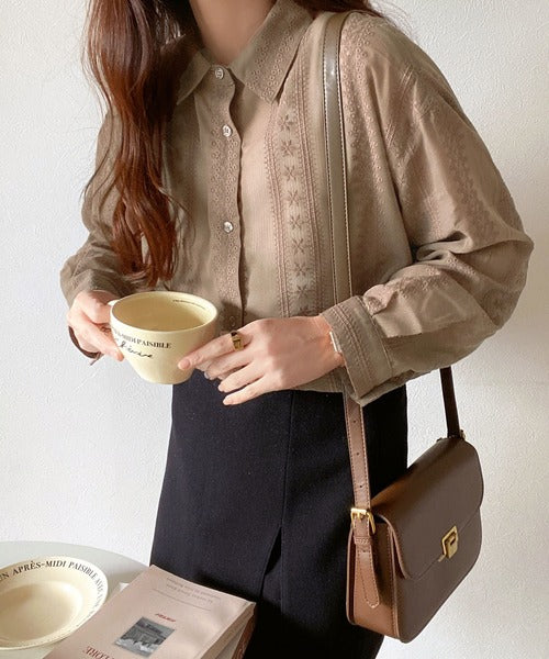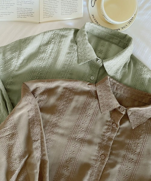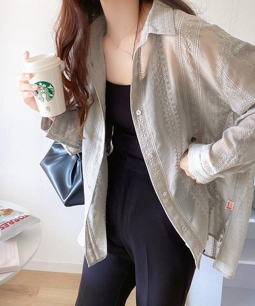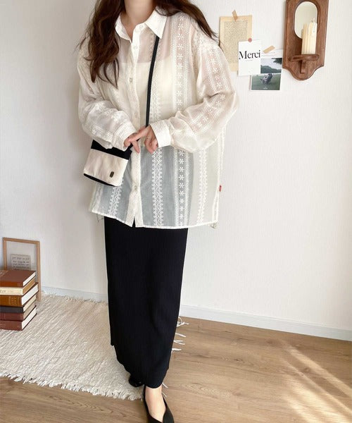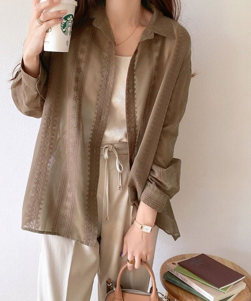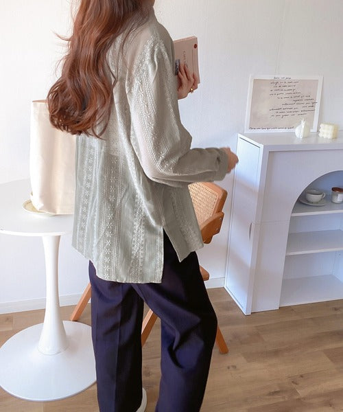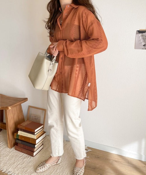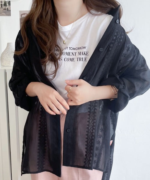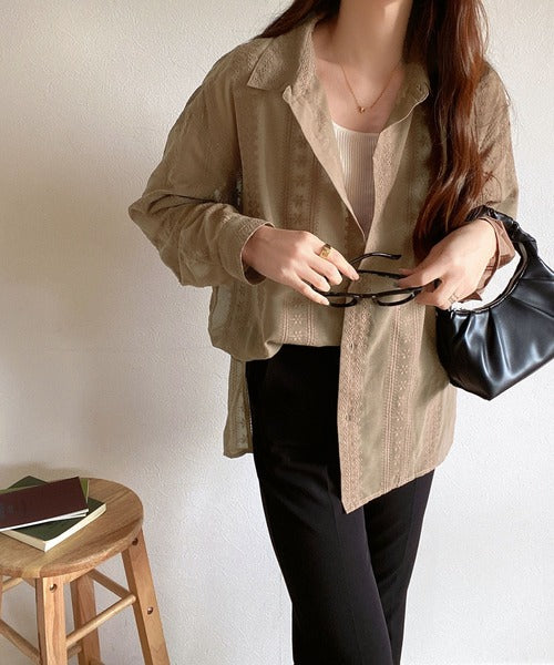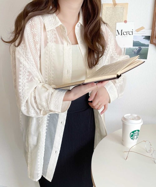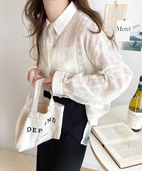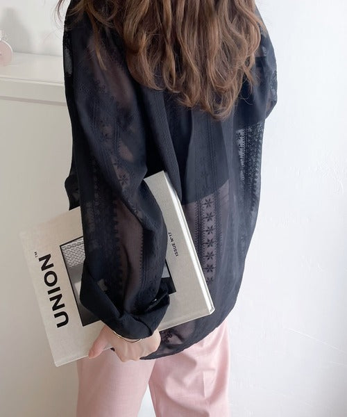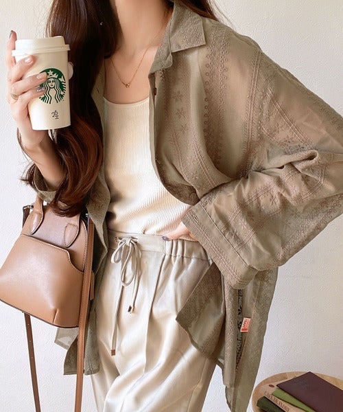 レトロな刺繍デザインが目を惹くシアーシャツ。