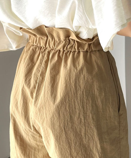 ワッシャー加工を施しメンズライクながらも、ウエストにはたっぷりギャザーを