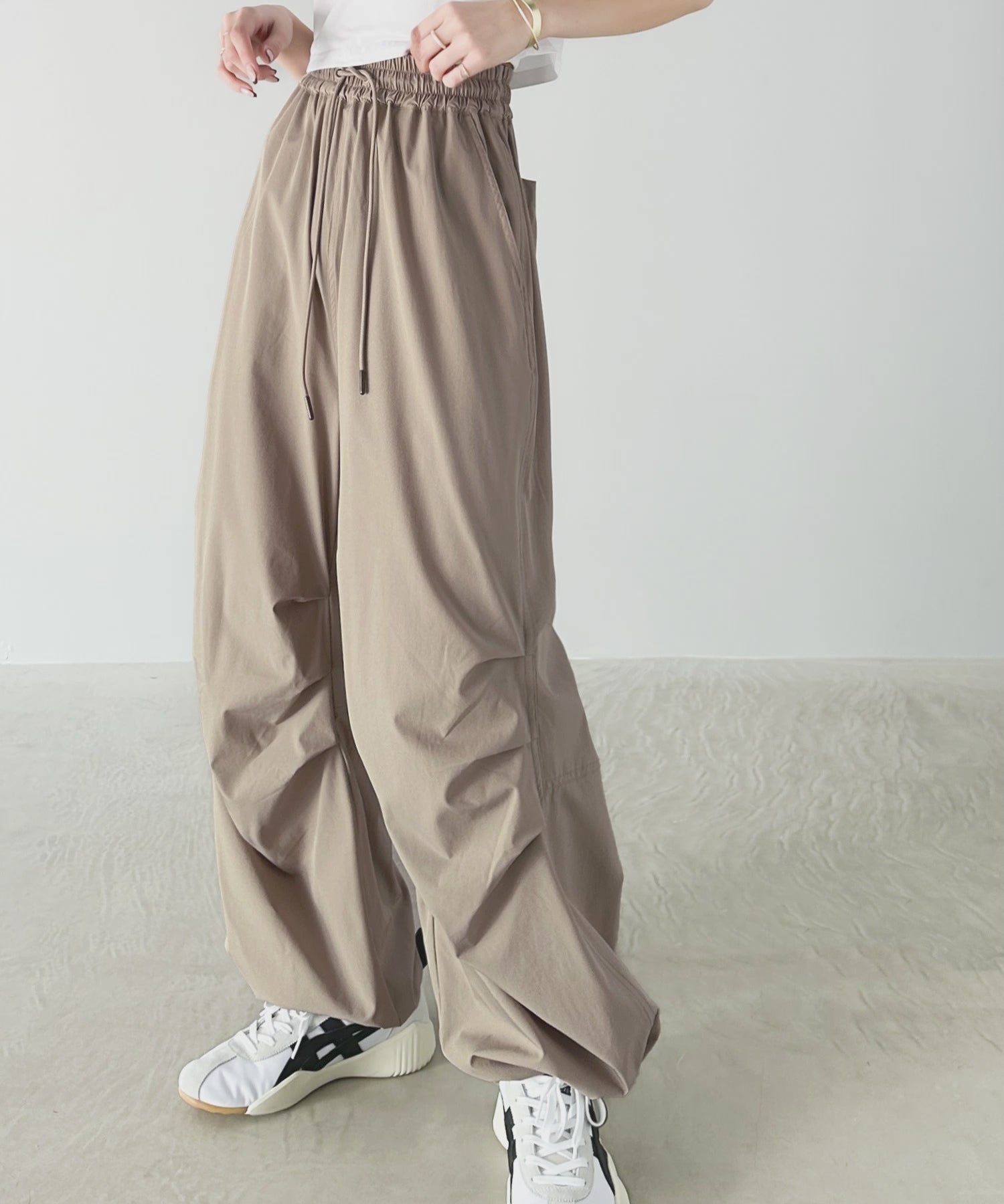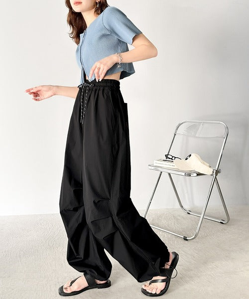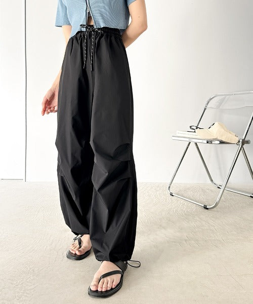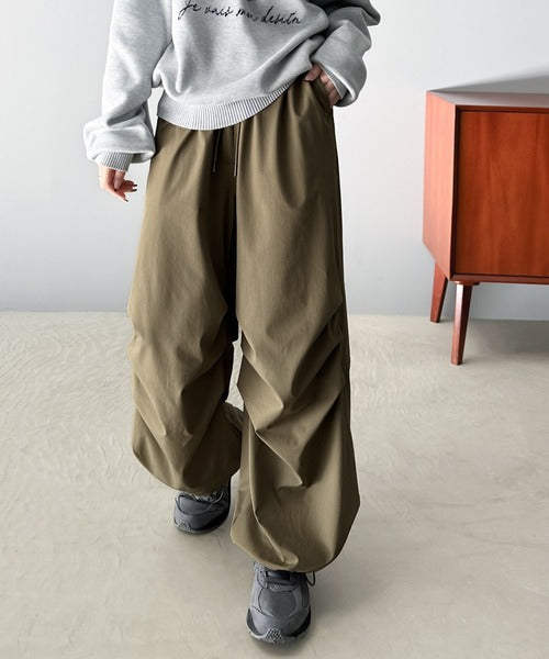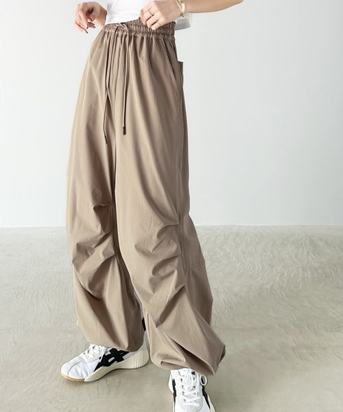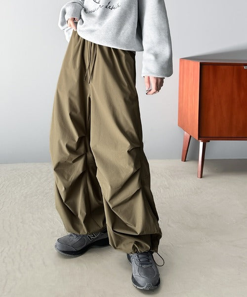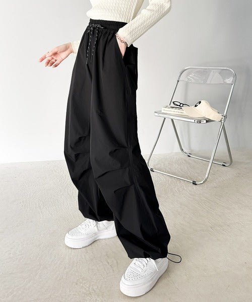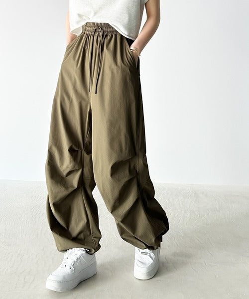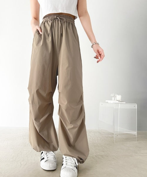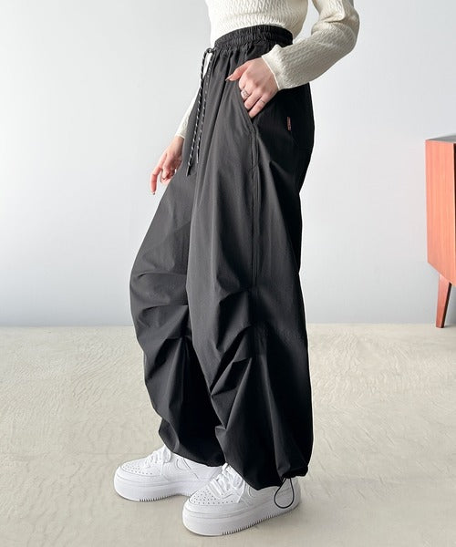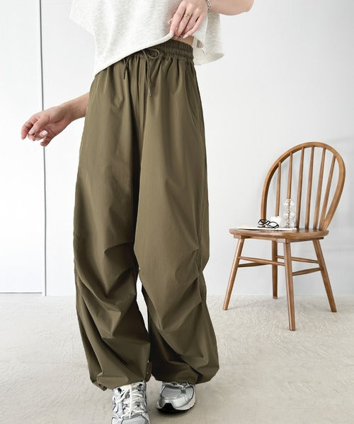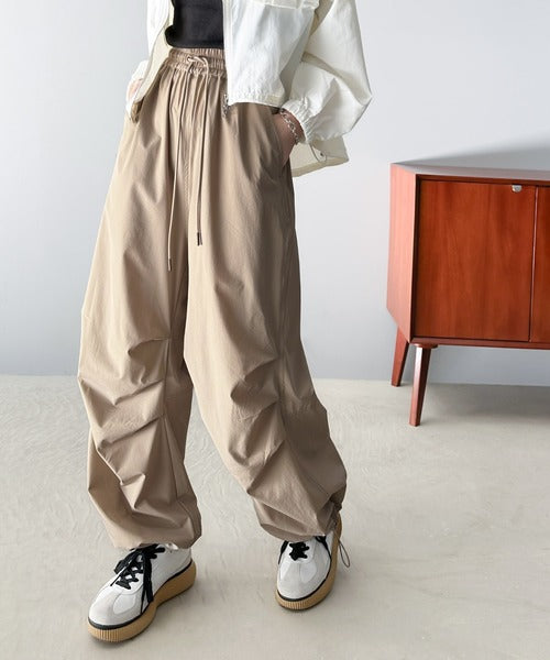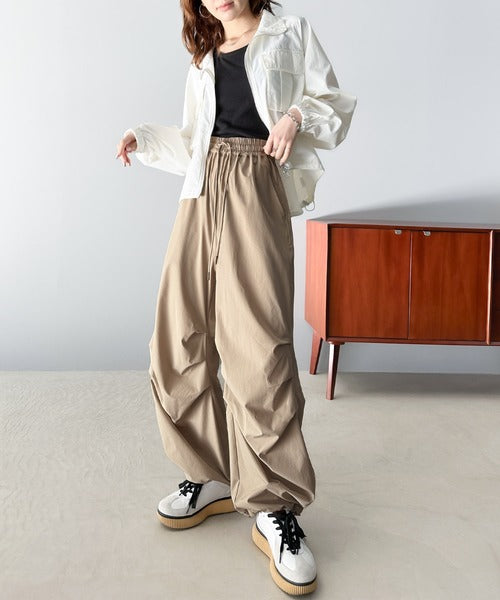 裾を絞ってパラシュートパンツにすればラフな着こなしに。