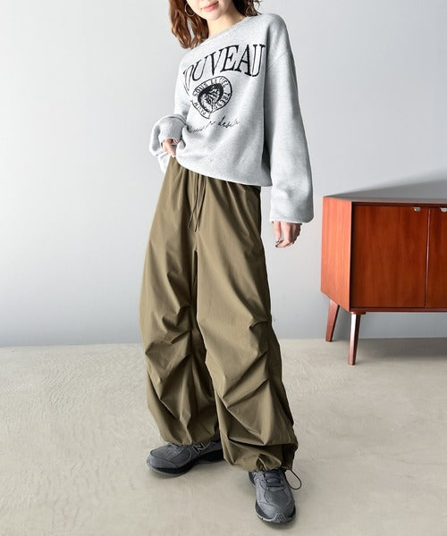 トレンドのハリ感のある生地を使用したスポーティな印象のオーバーパンツ。