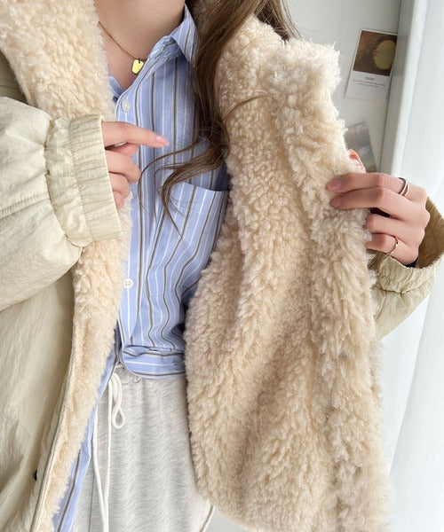 衿元までしっかりファーで覆われた暖かブルゾン。