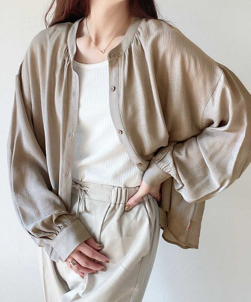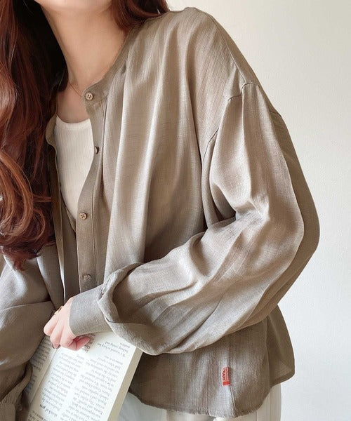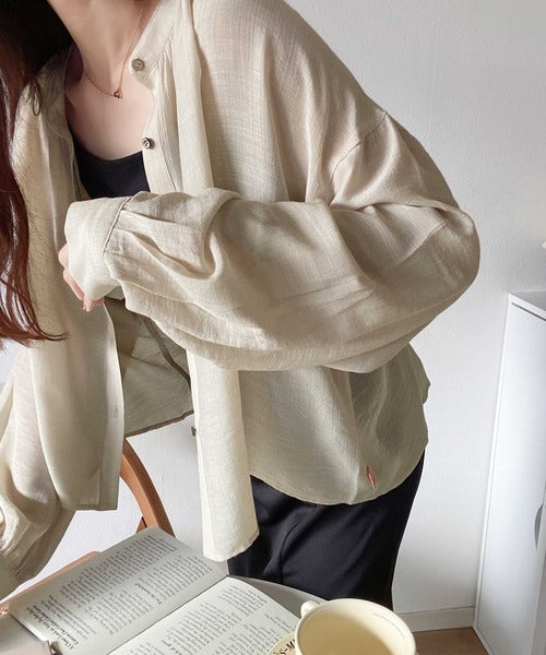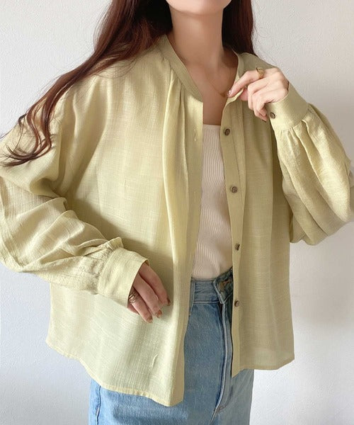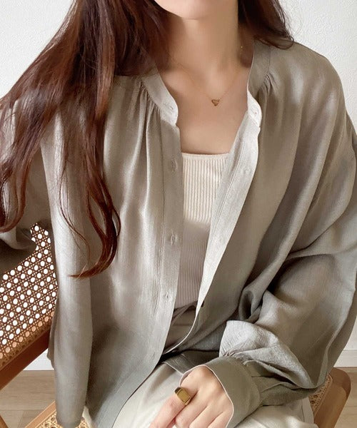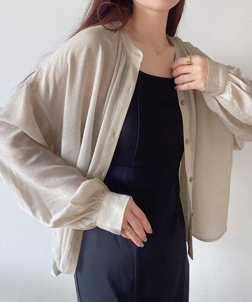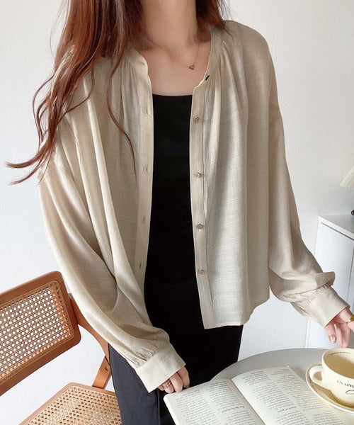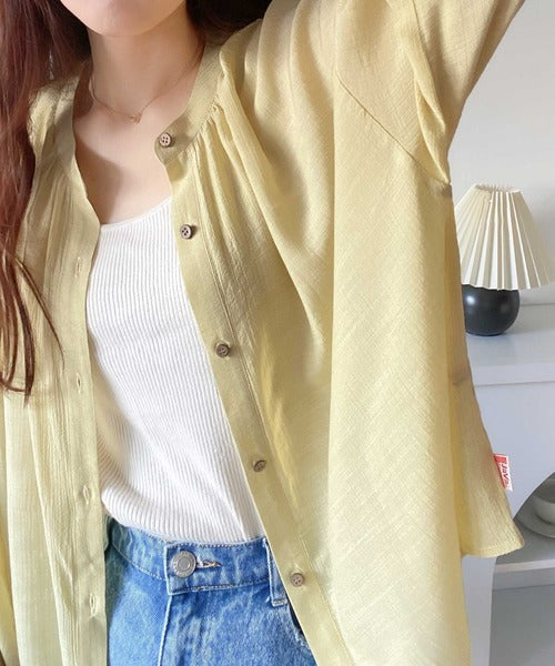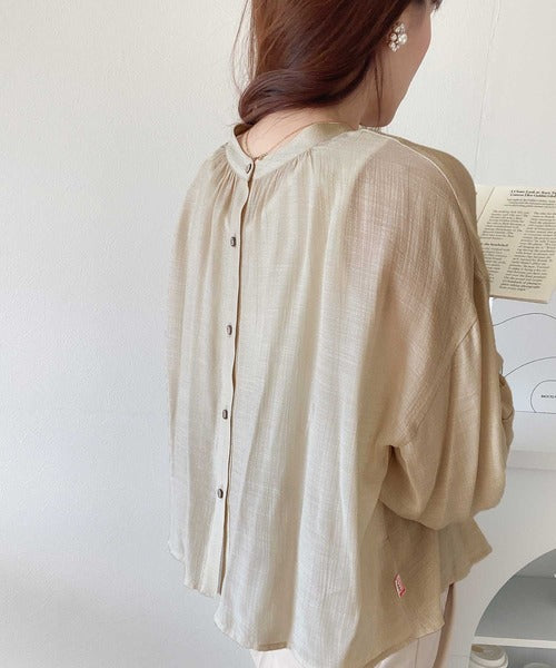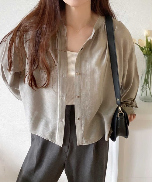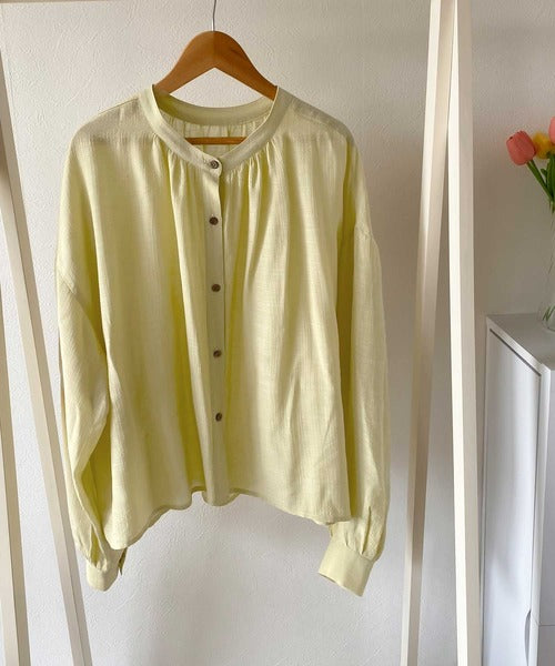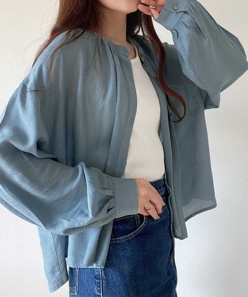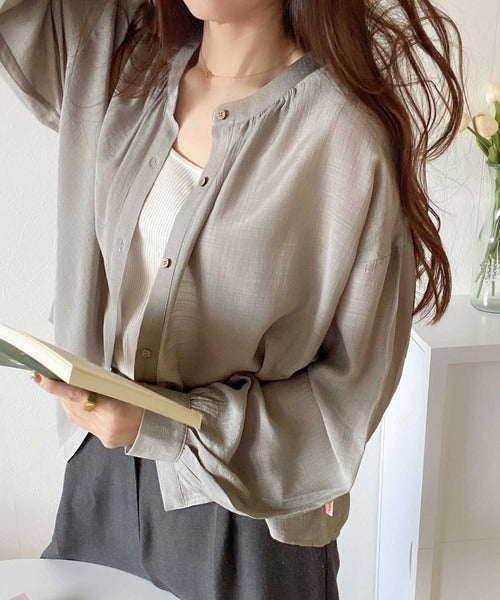 程よい透け感の大人っぽシアーバンドカラーブラウス。