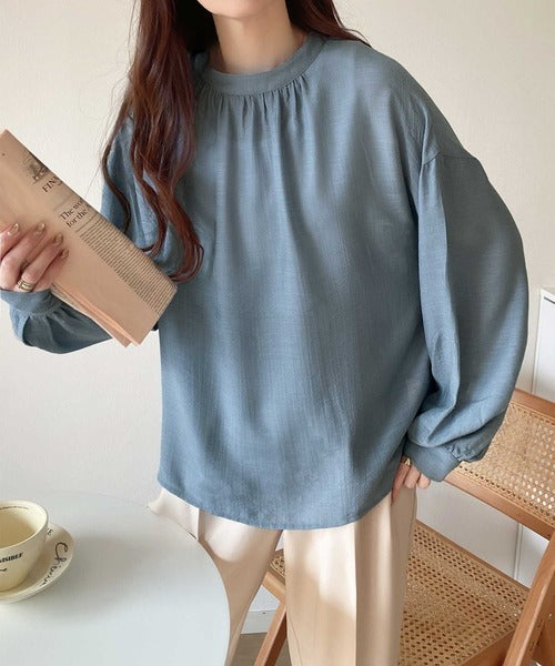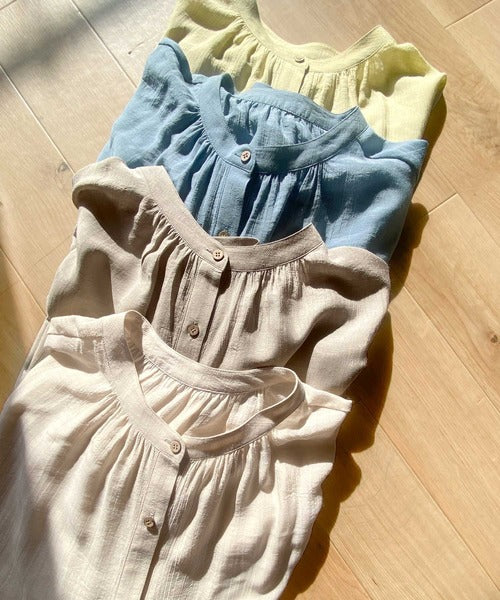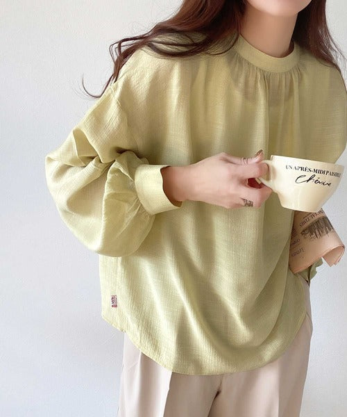 袖と襟元にたっぷりギャザーを寄せ、ふんわりボリュームスリーブで