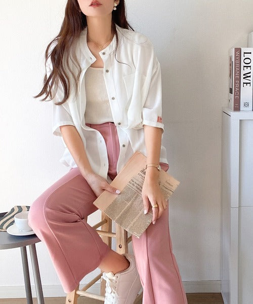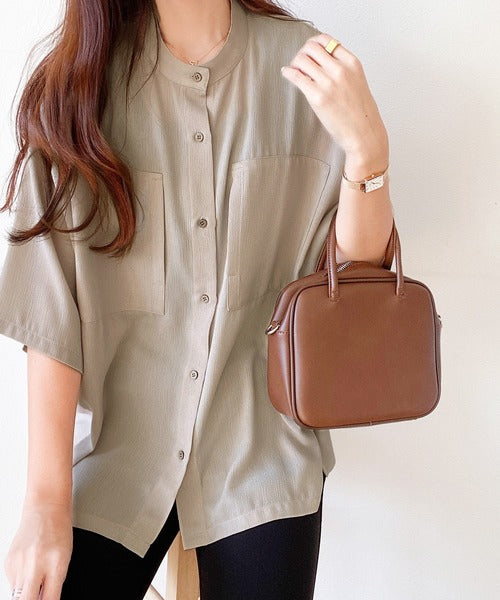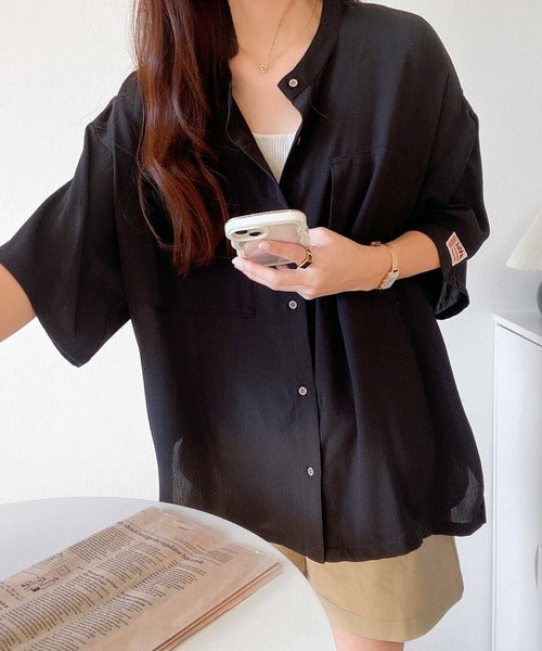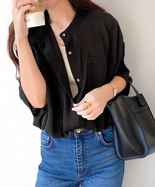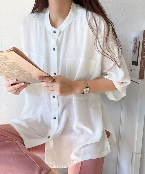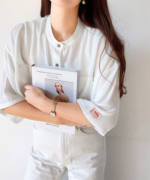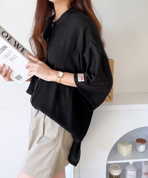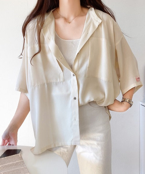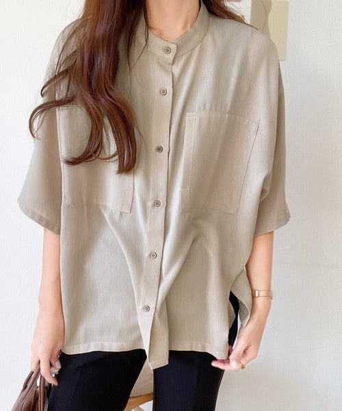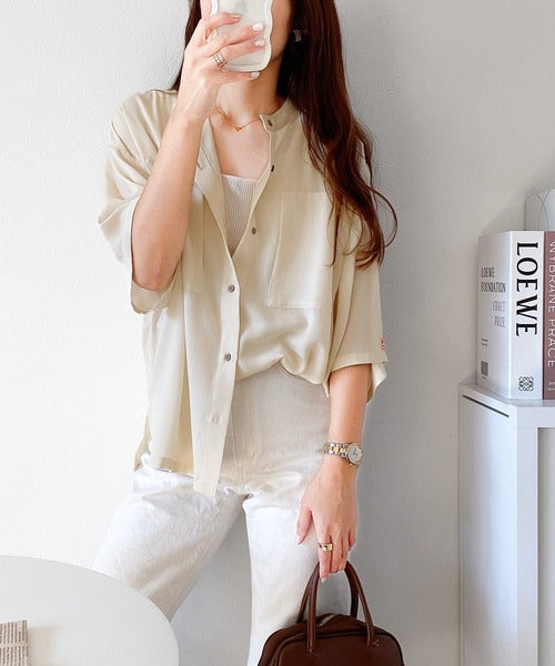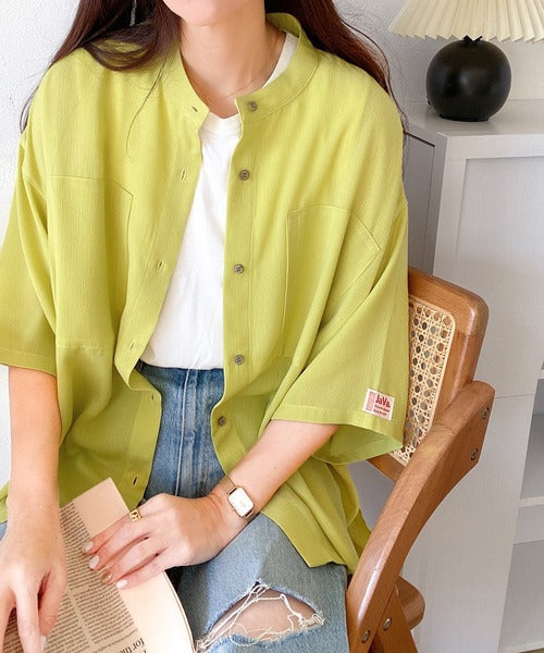 《JaVaジャバ コラボ》大人の好印象。楊柳バンドカラー五分袖オーバーシャツ jv1110015