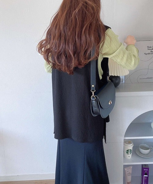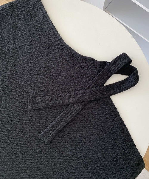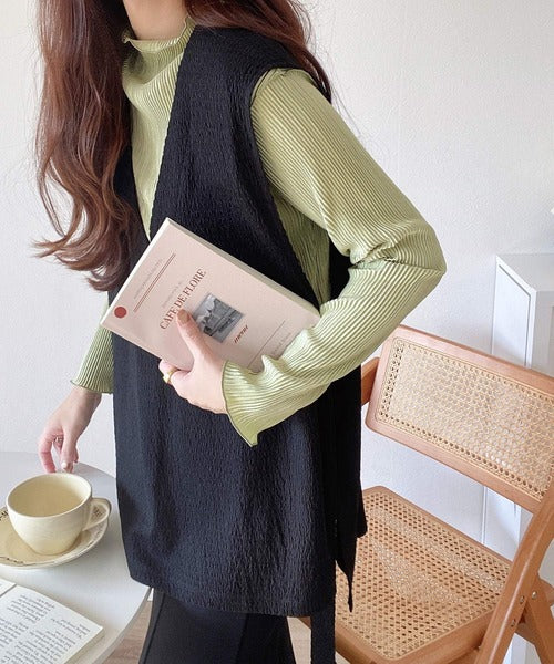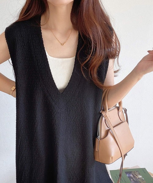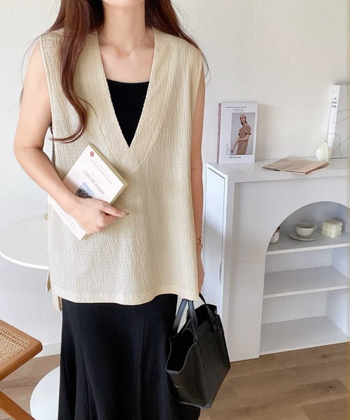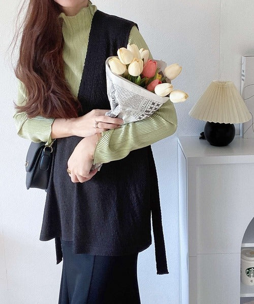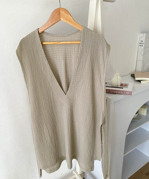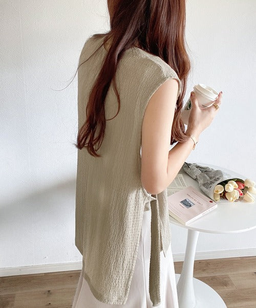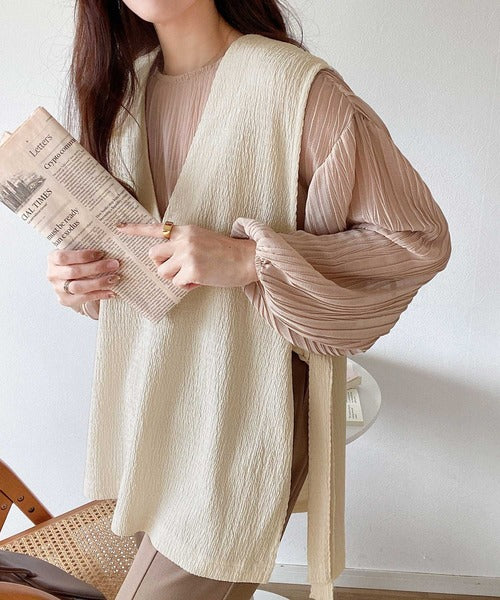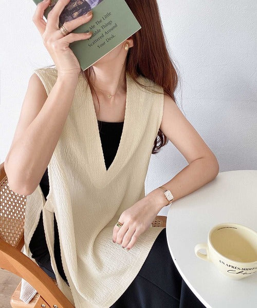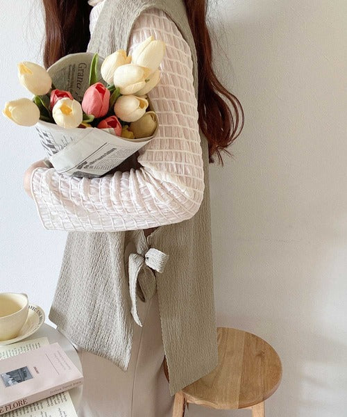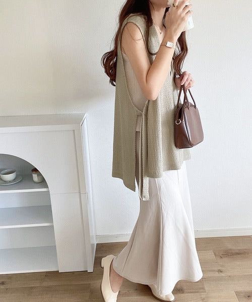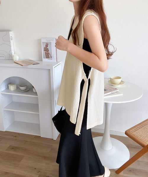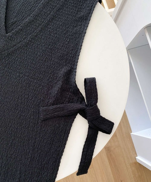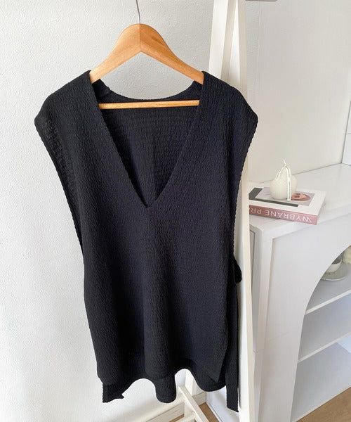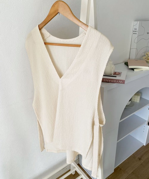 凸凹な素材感とサイドリボンがアクセントで目を惹き、シンプルなコーデでも大人カジュアルに決まるVネックベスト。