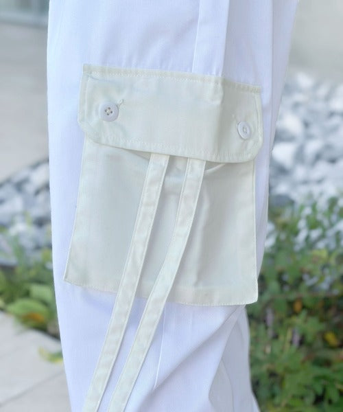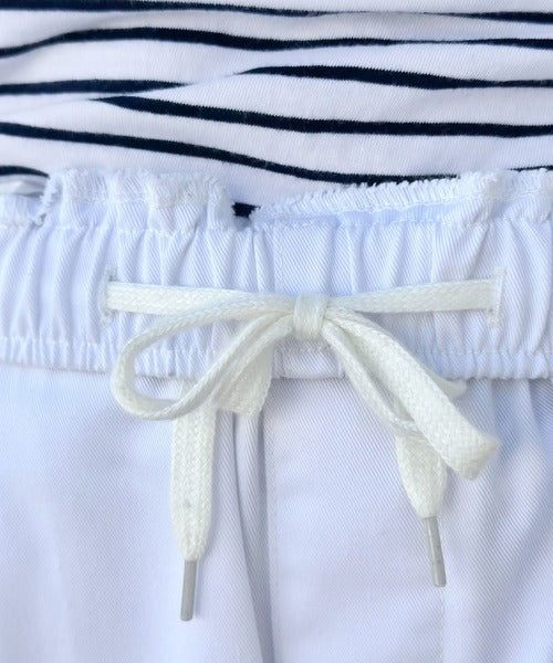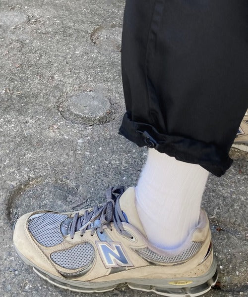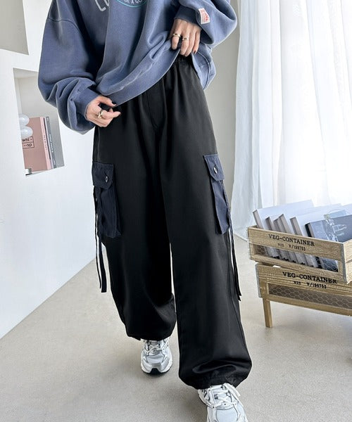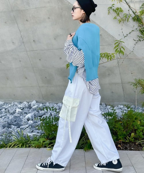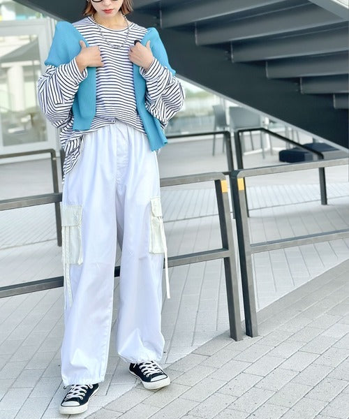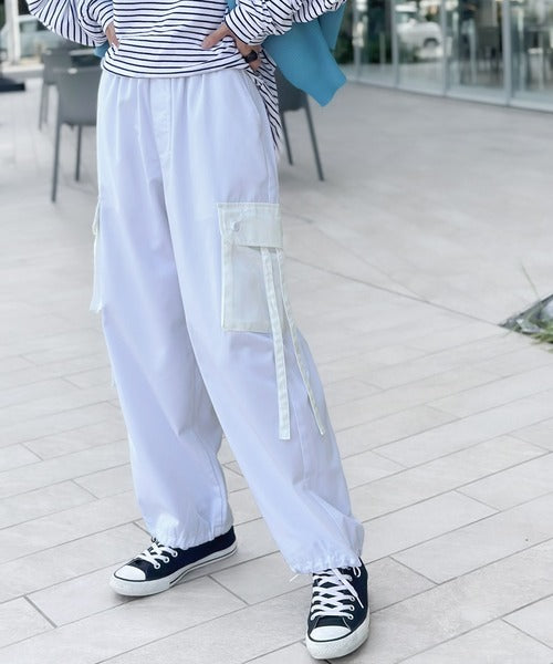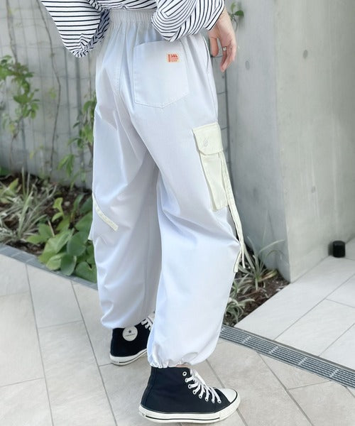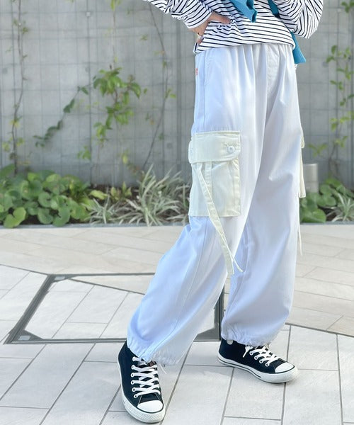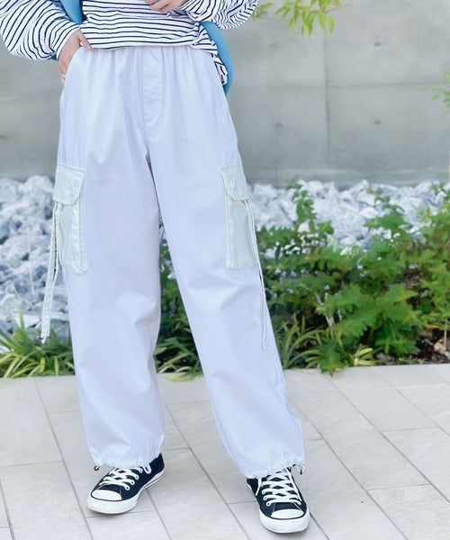 トレンドのカーゴパンツのポケットとドローコードを配色にしデザインポイントに。