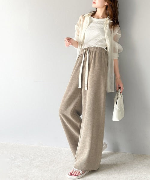 ウエストの垂らした太紐がアクセントになり、スタイリッシュで垢抜けた大人カジュアルコーデに仕上げます!