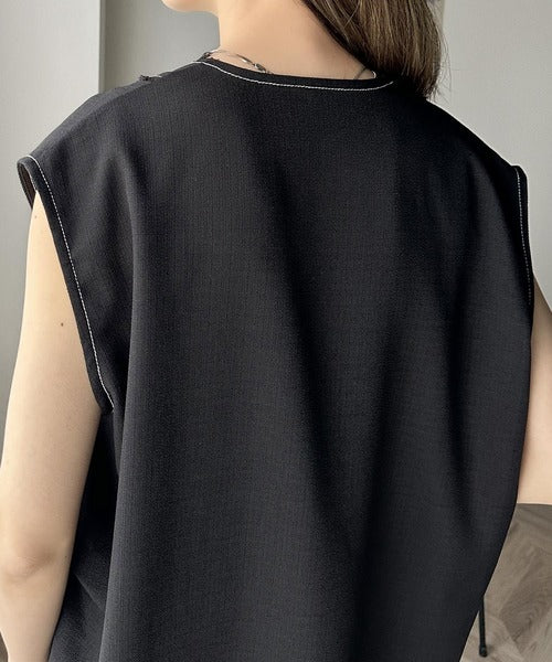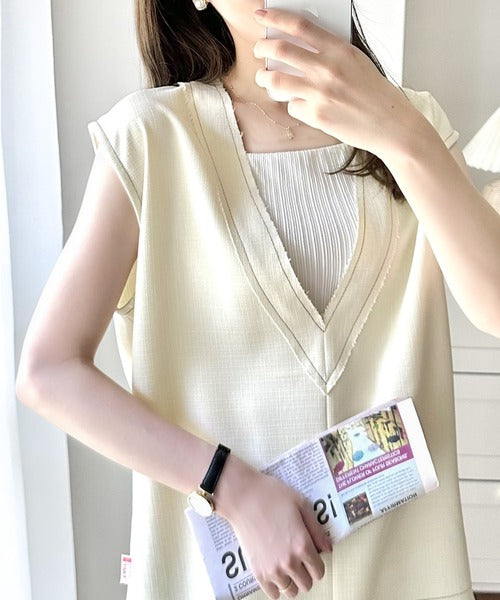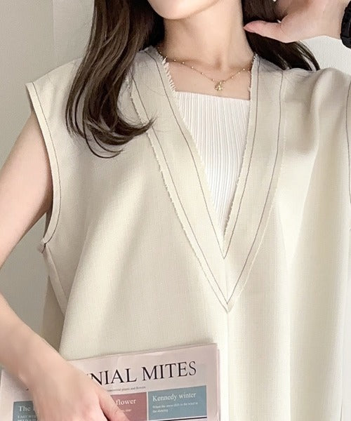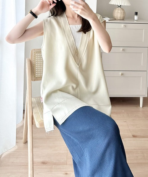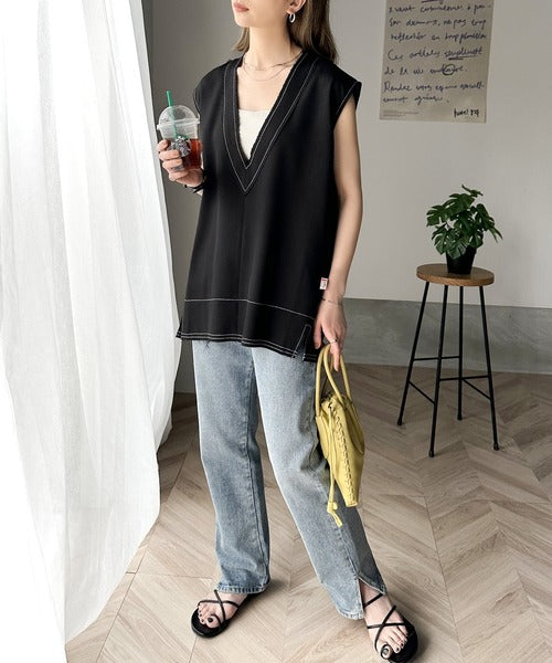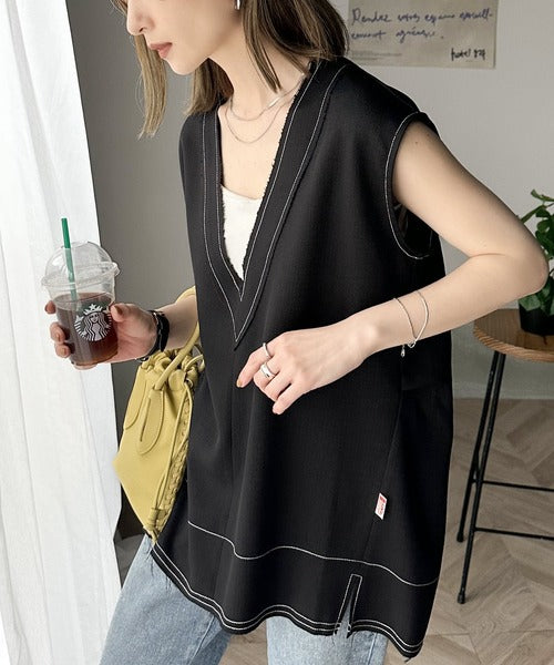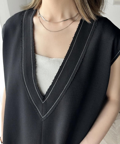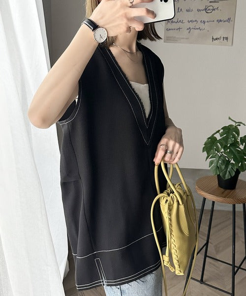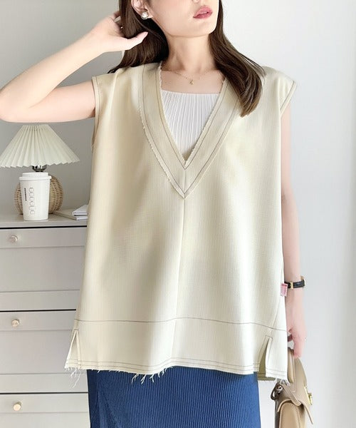 切りっぱなしデザインと配色ステッチがこなれ感を演出してくれるVネックベスト。
