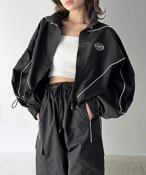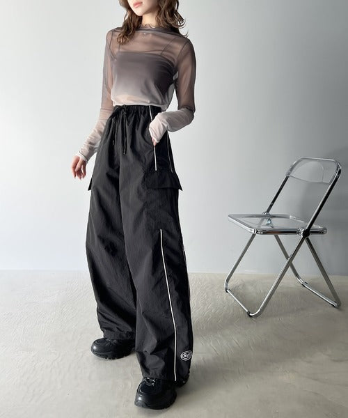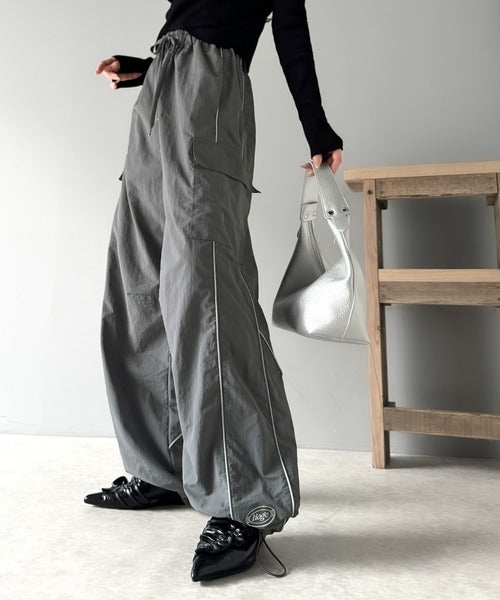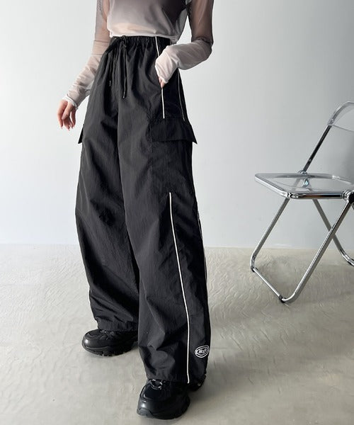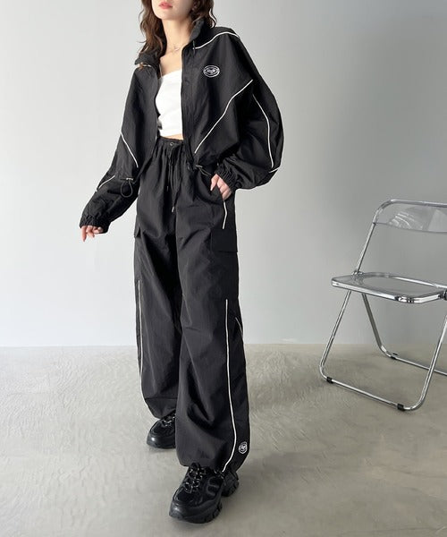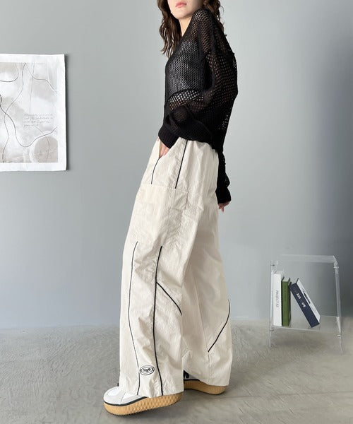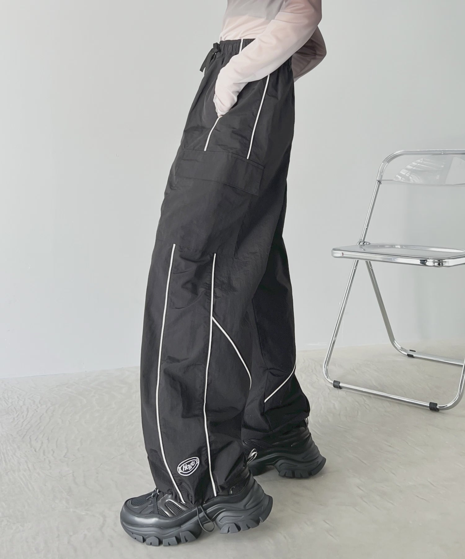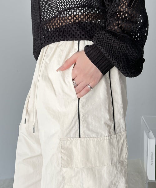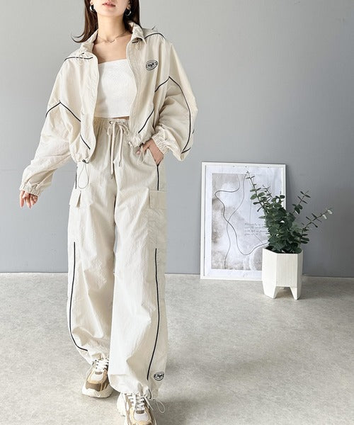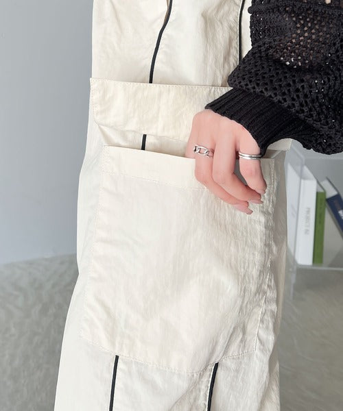 今年らしいトラックパンツにカーゴポケットや配色パイピングでアクセントを効かせた1枚。