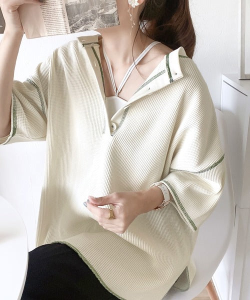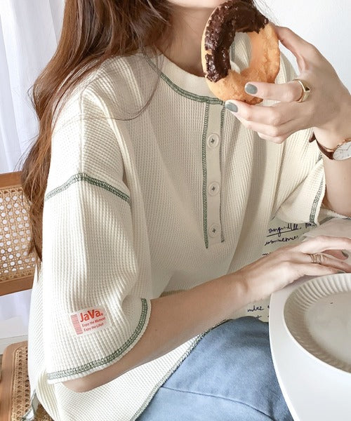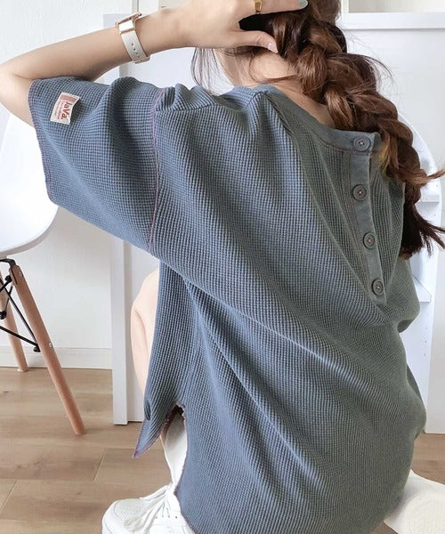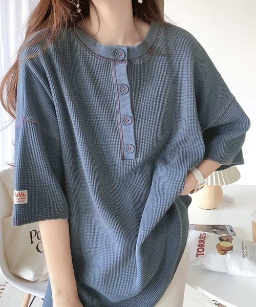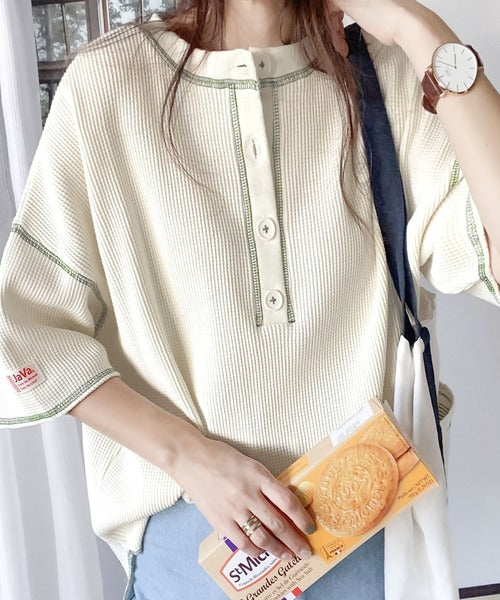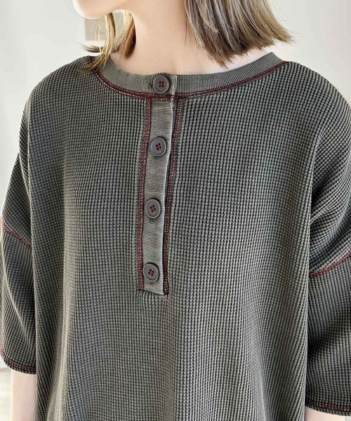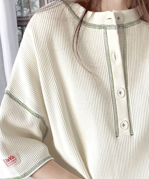 ヘンリーネックデザインと凹凸感のある綿100%のワッフル素材で