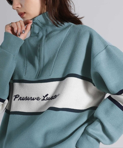スポーティーかつ古着ライクな配色切り替えとグラフィックが印象的なニットプルオーバー。