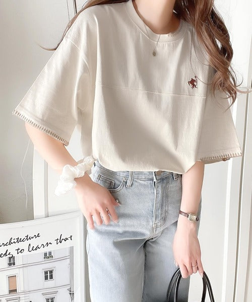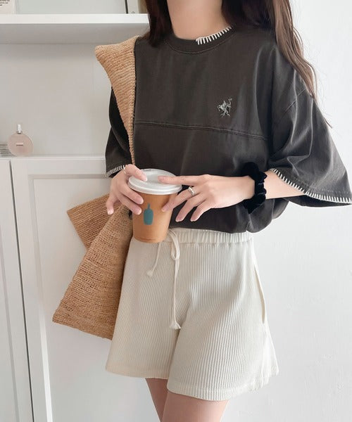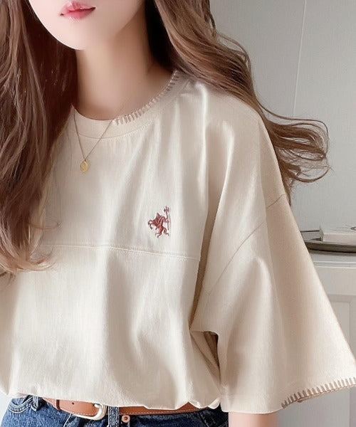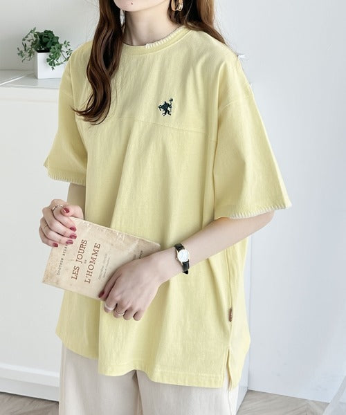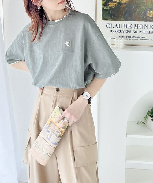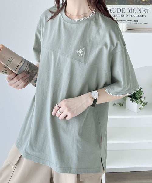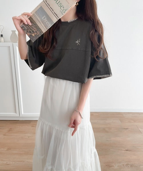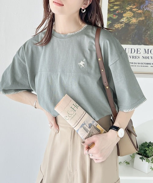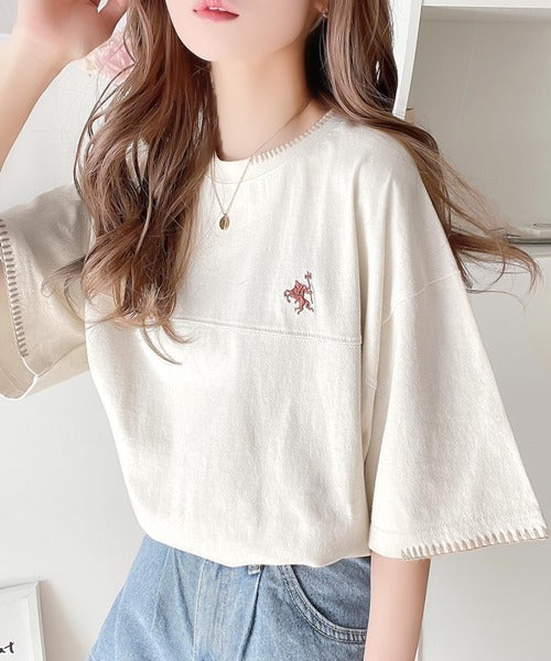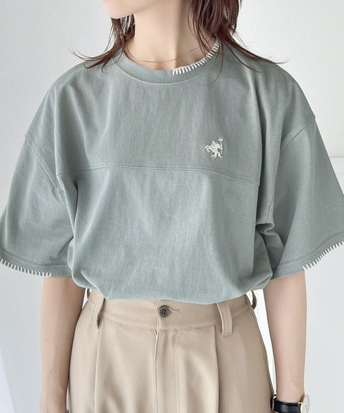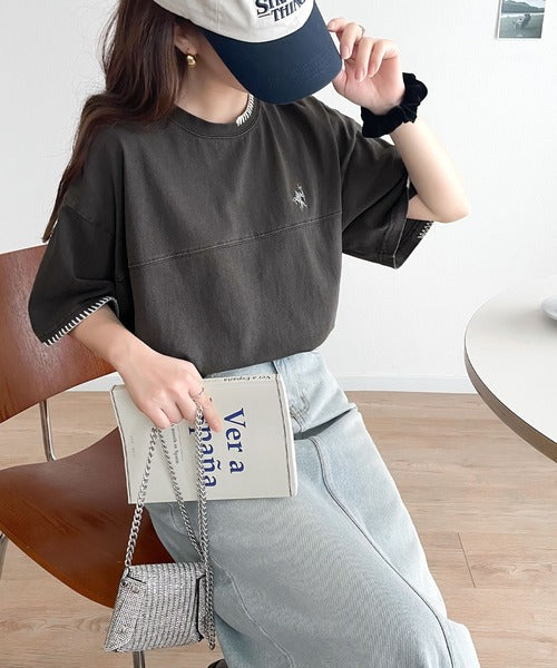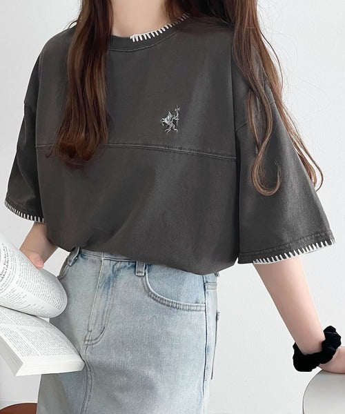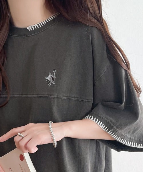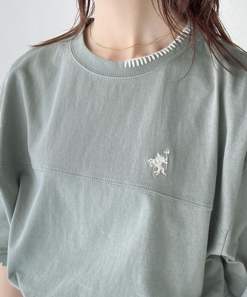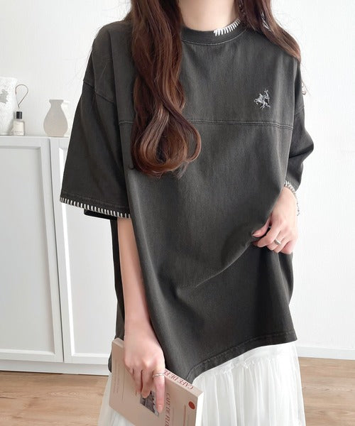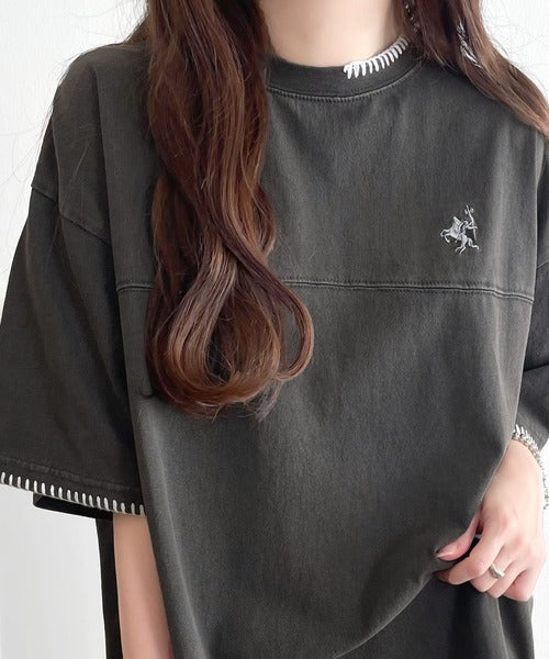 《Javaジャバコラボ》ステッチデザインが目を惹く。綿100%ワンポイントハンド刺繍ピグメントTシャツ jv1260109