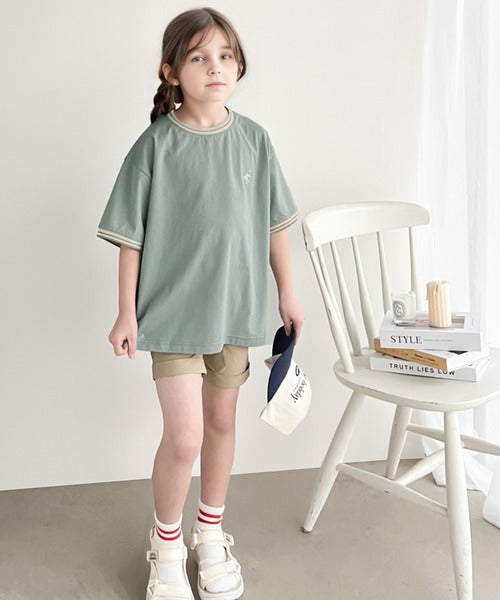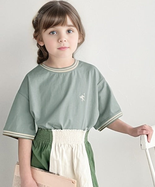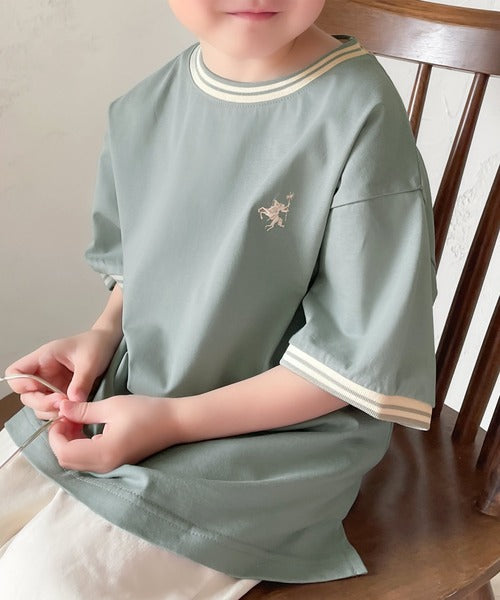 ネックと袖口にリブラインを使用し、ワンポイント刺繍を施したTシャツ。