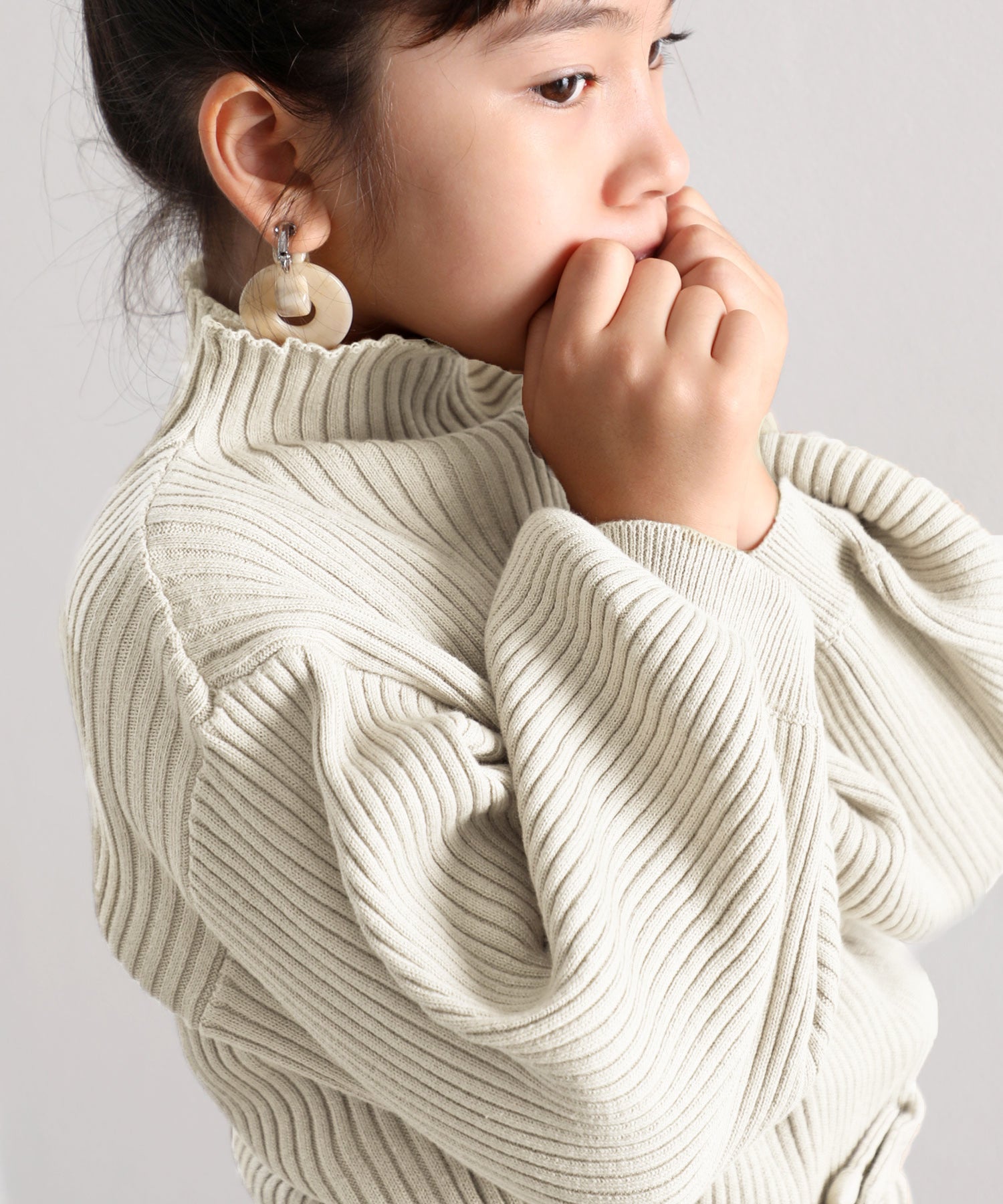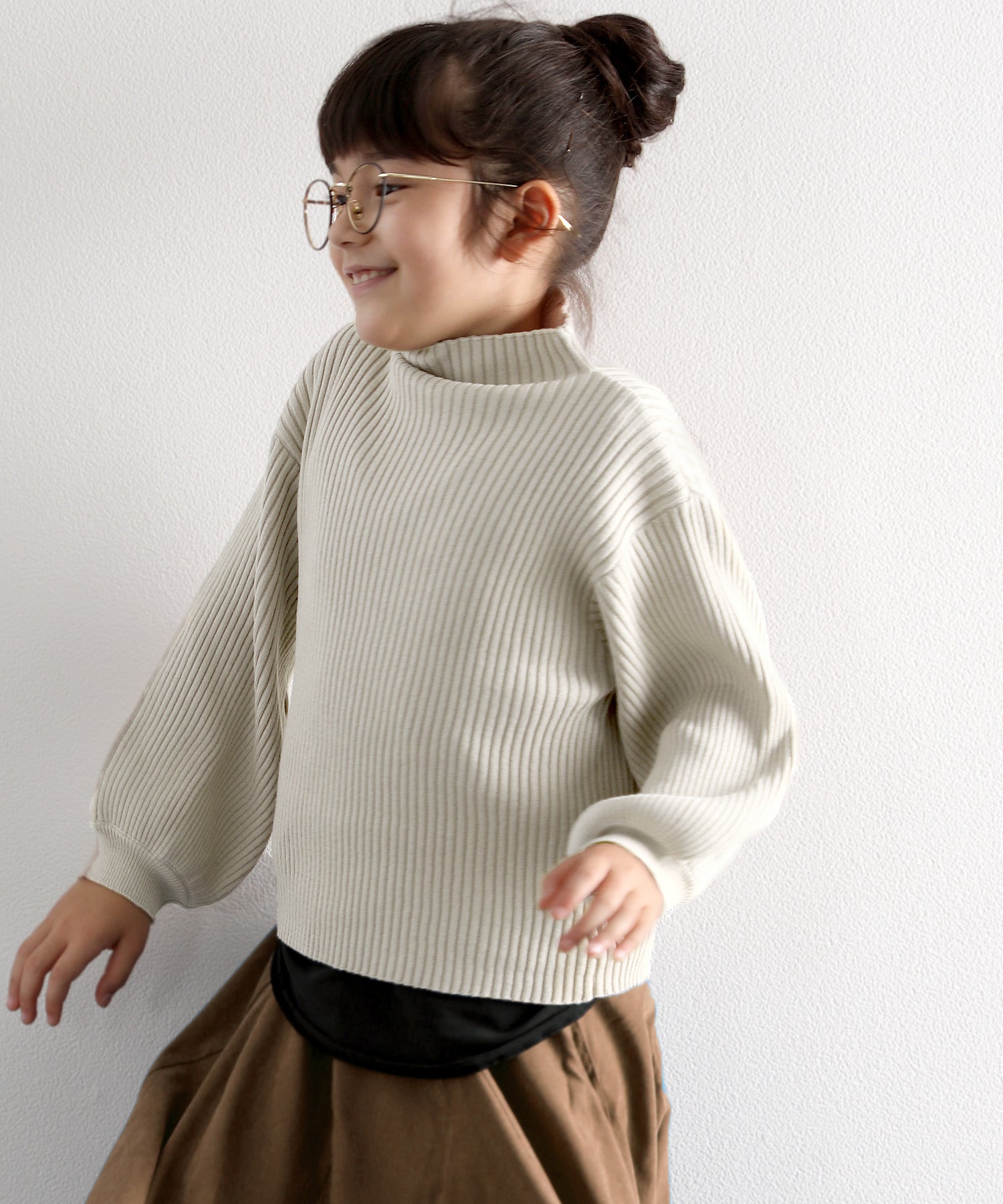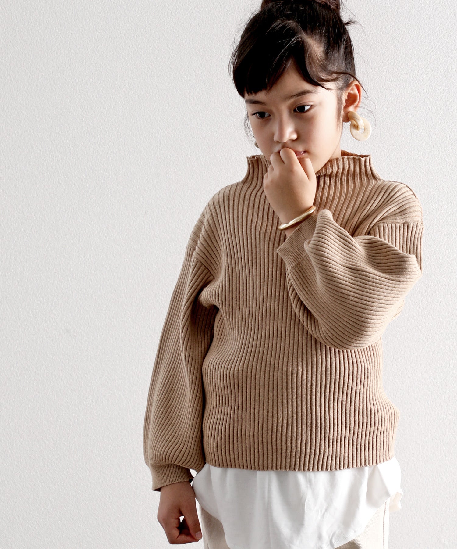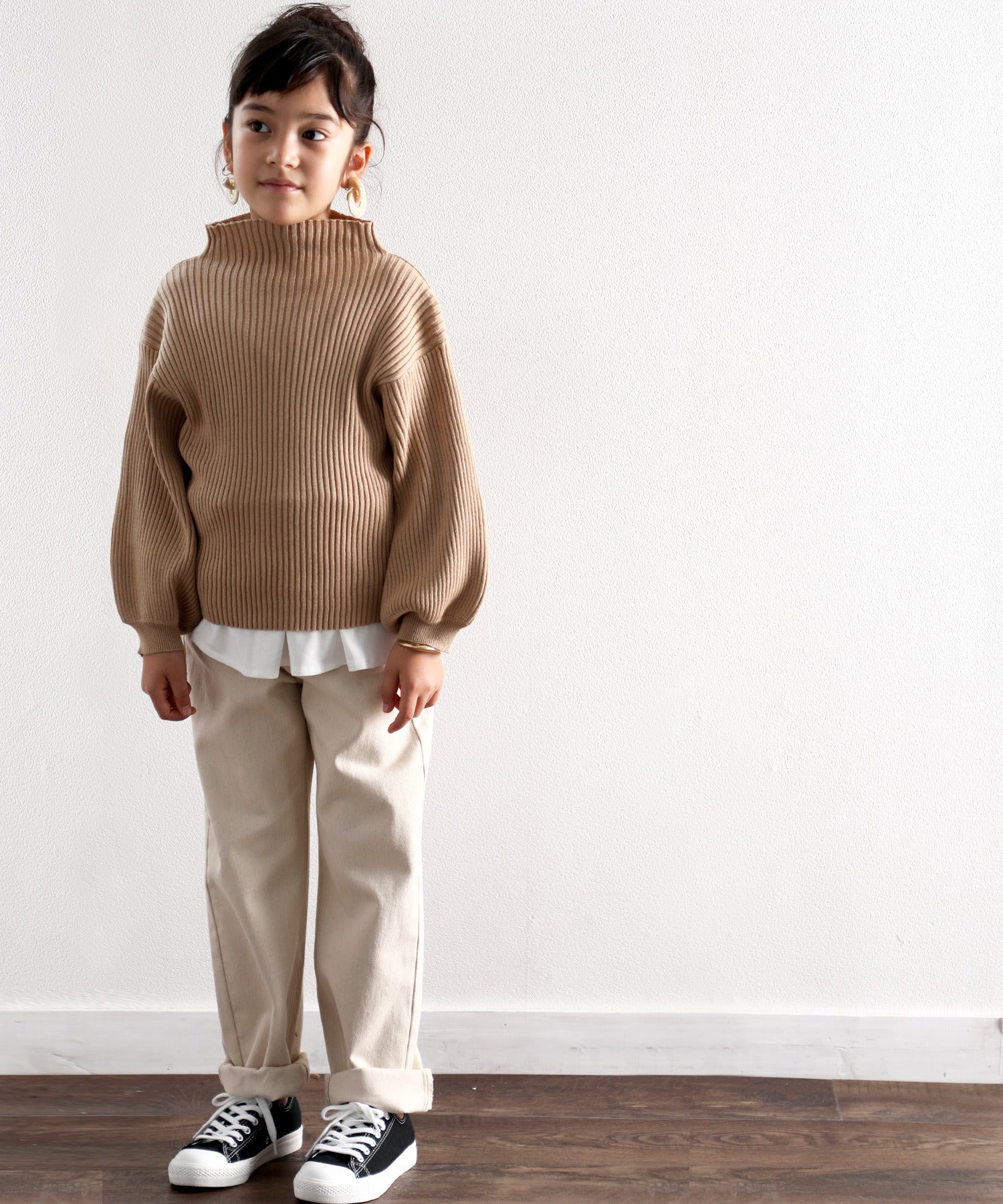 【family+】【親子コーデ】キッズ ワイドスリーブハイネックミドル丈コットンリブニット(長袖) kcl7004