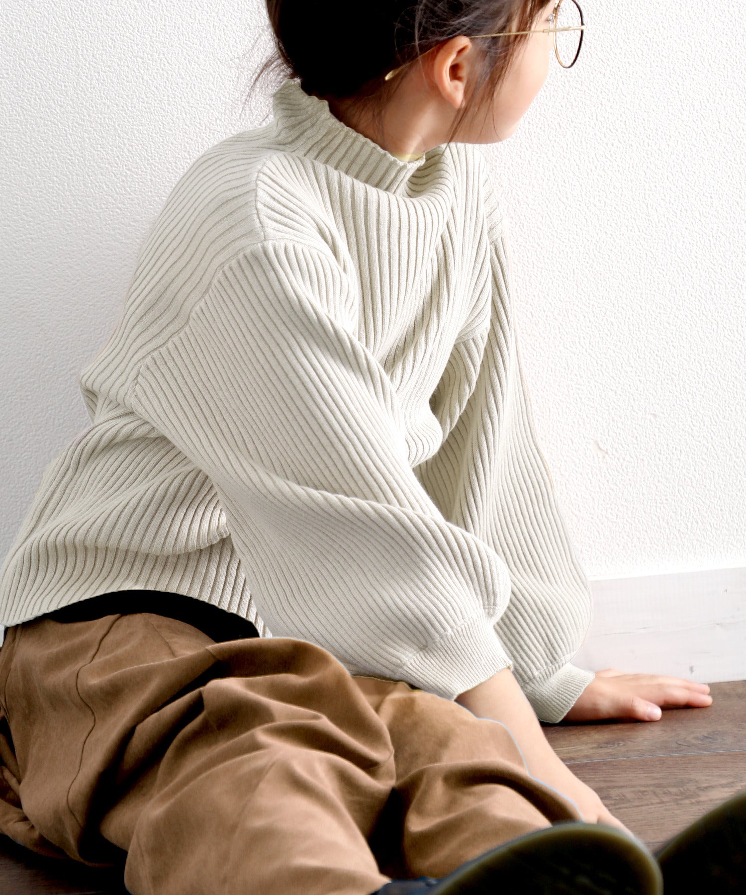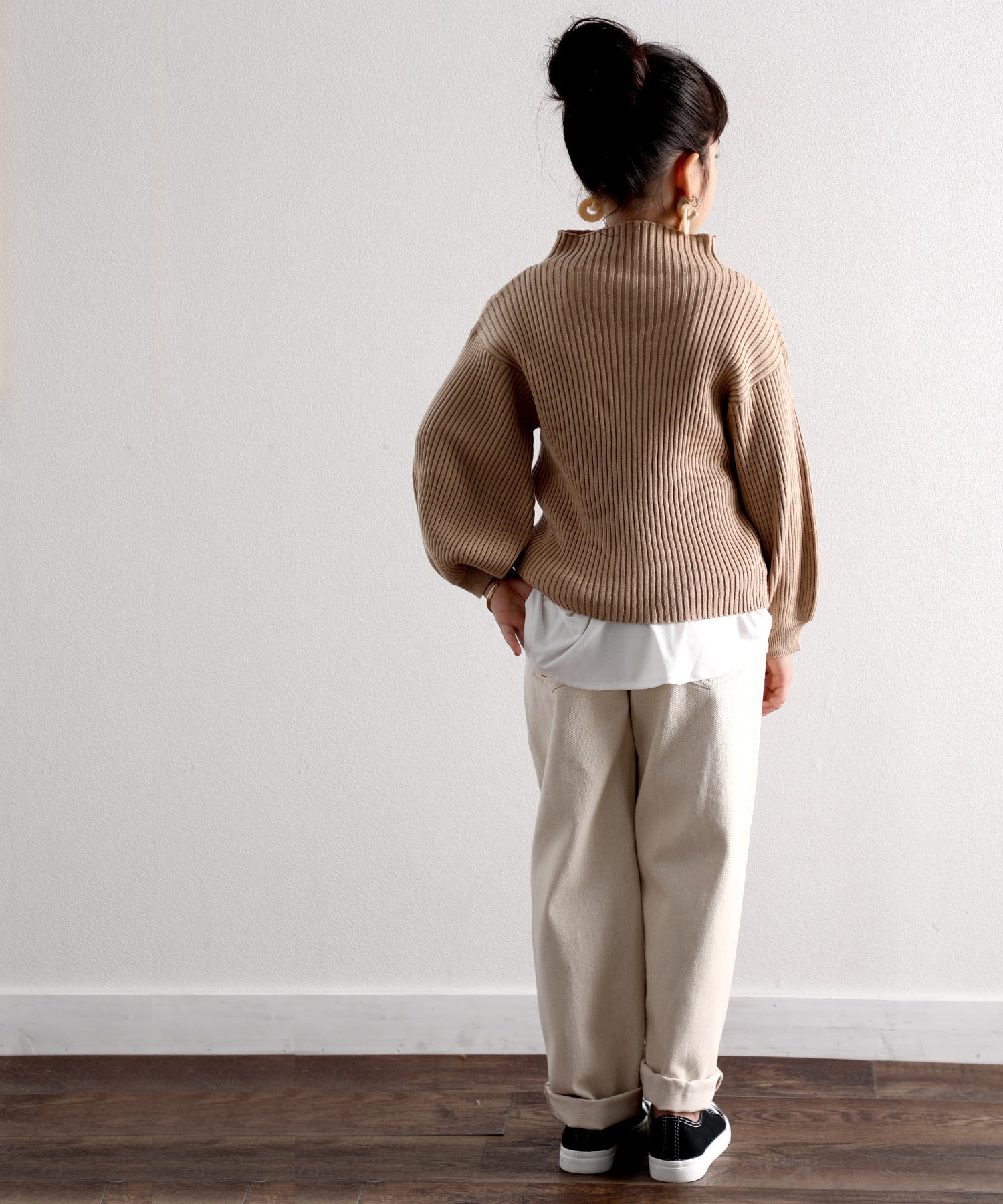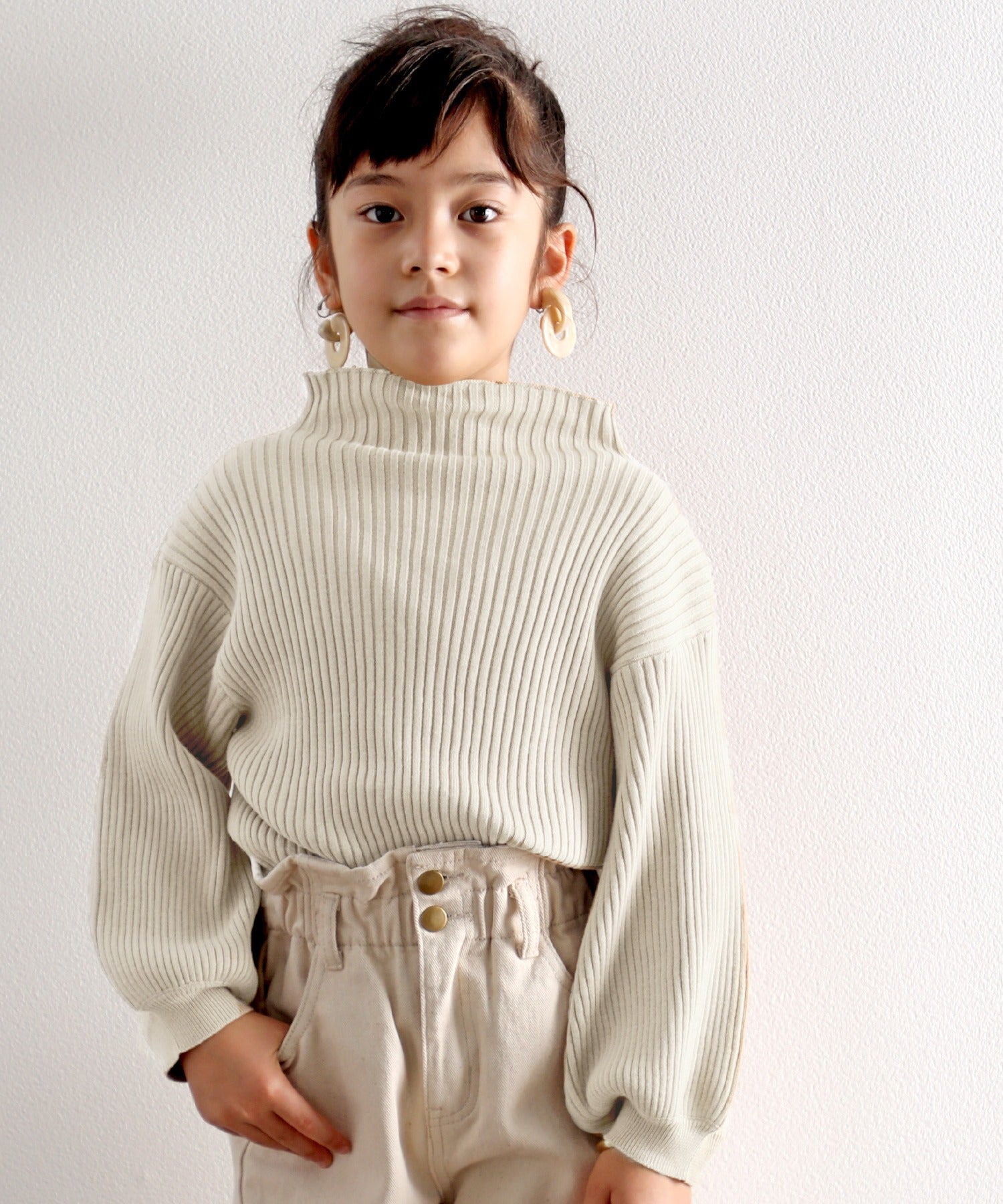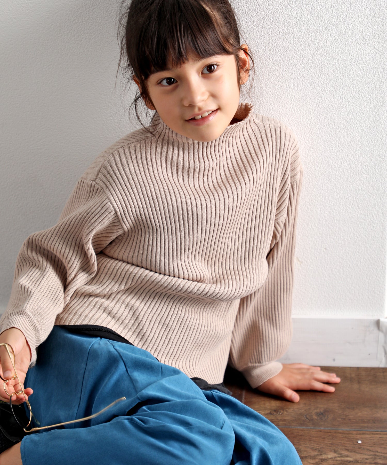 【family+】【親子コーデ】キッズ ワイドスリーブハイネックミドル丈コットンリブニット(長袖) kcl7004