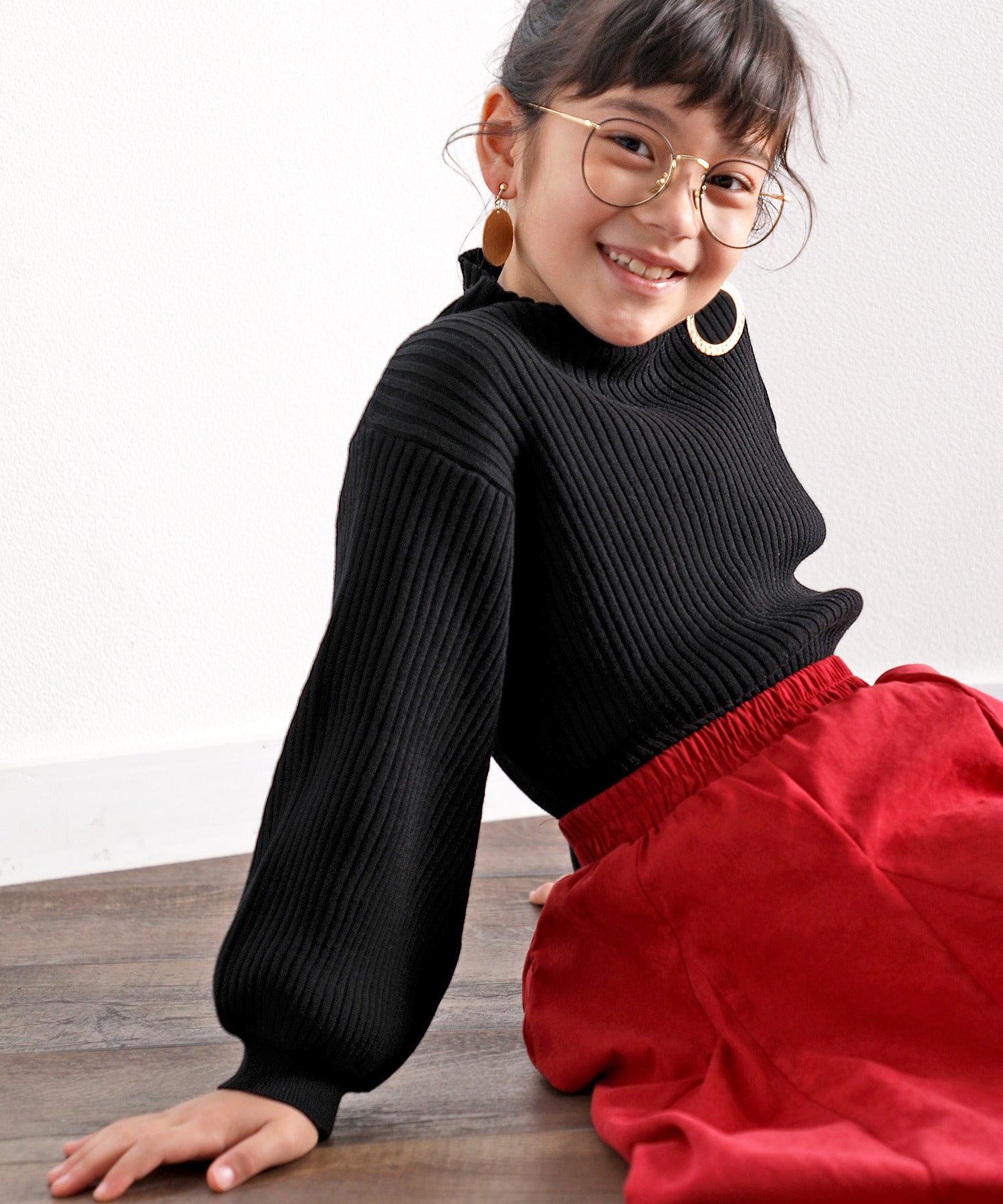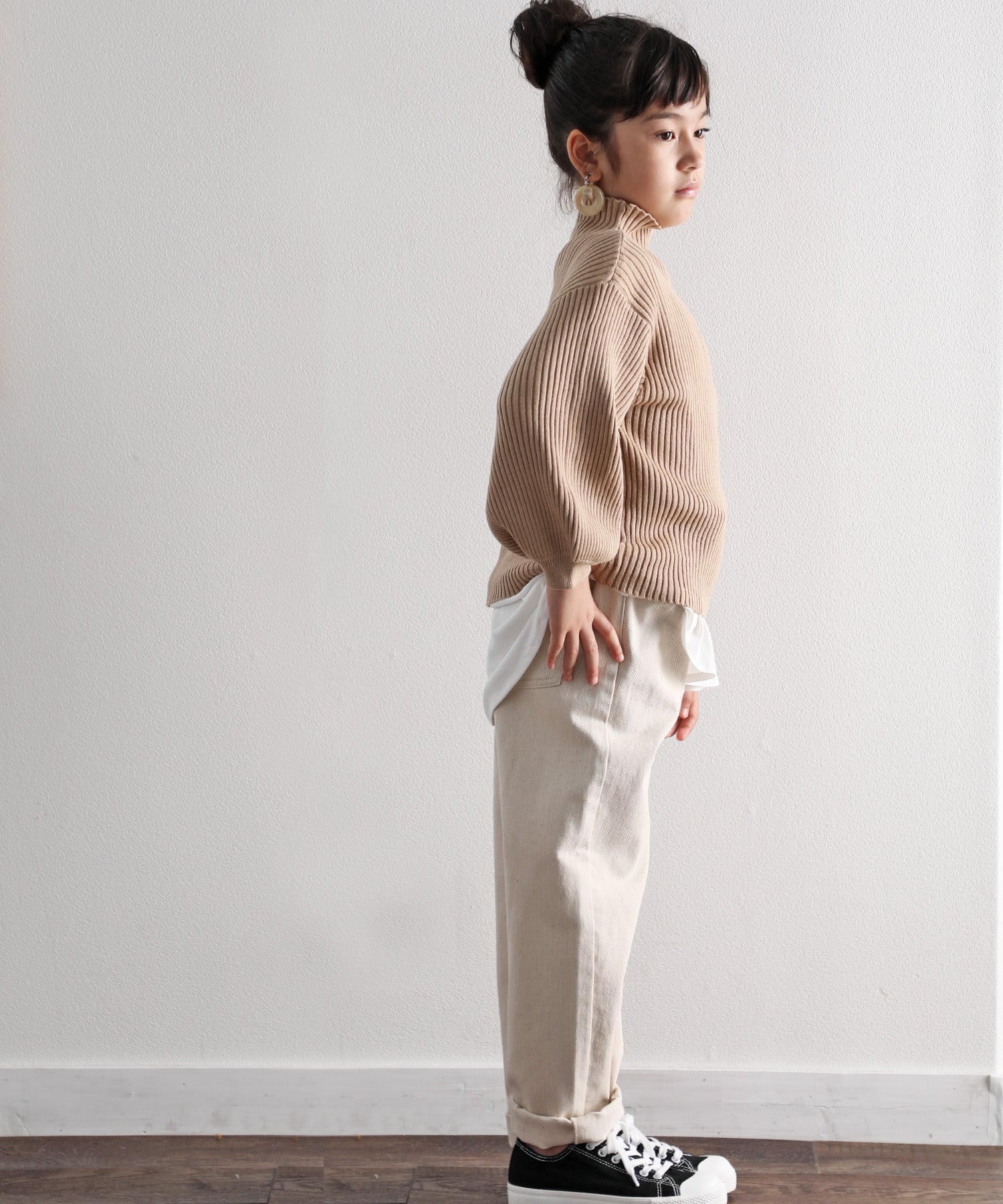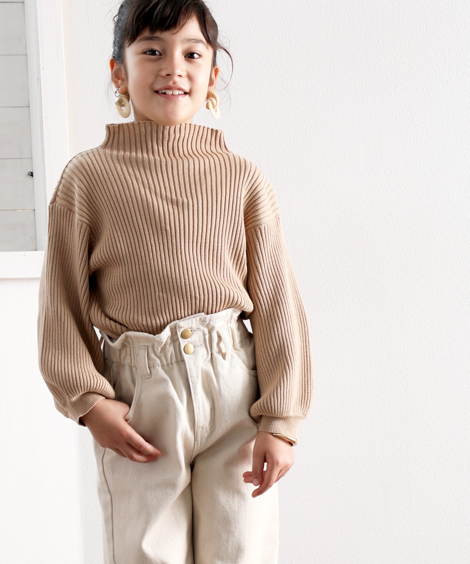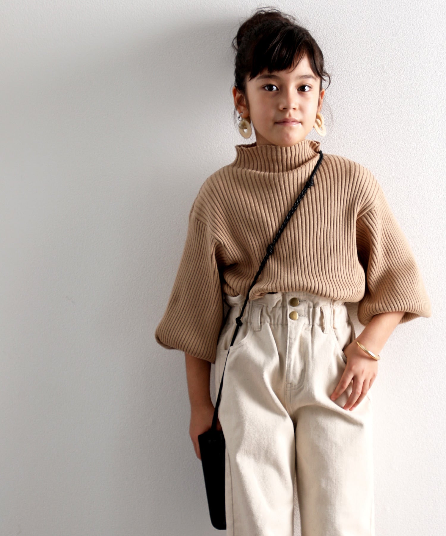 【family+】【親子コーデ】キッズ ワイドスリーブハイネックミドル丈コットンリブニット(長袖) kcl7004