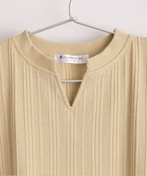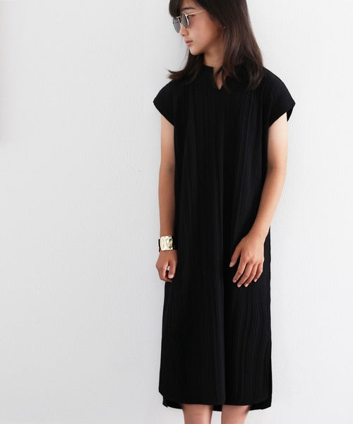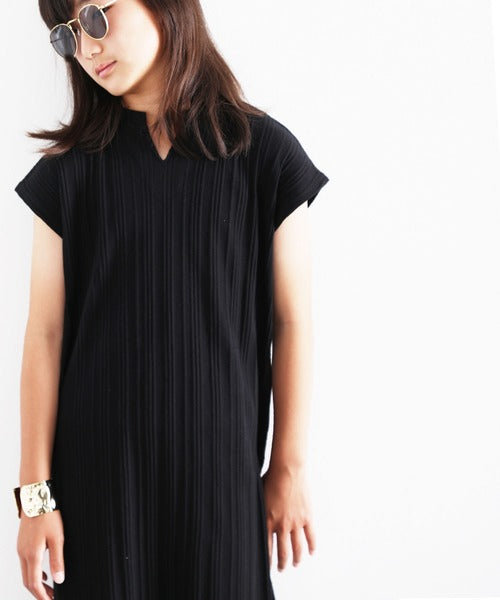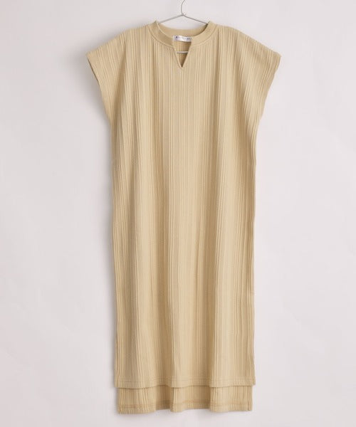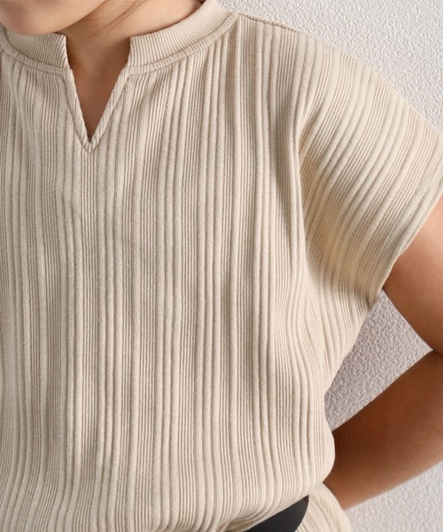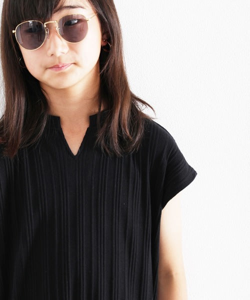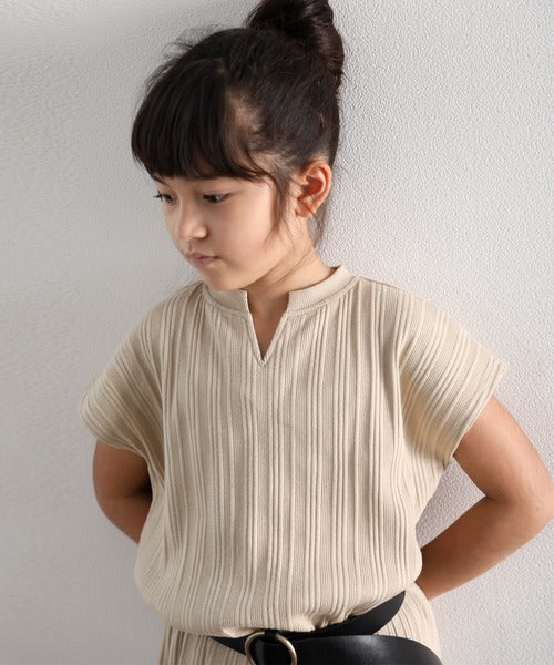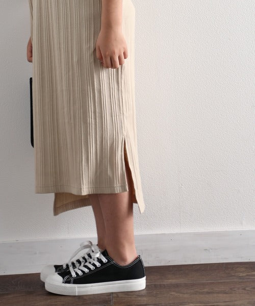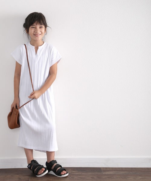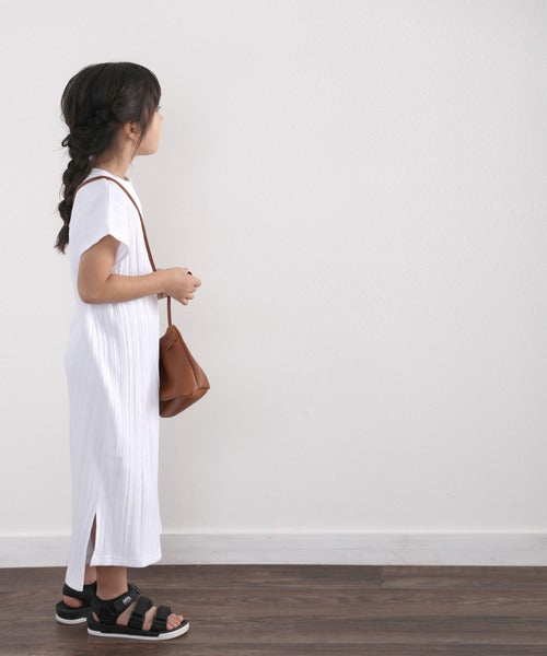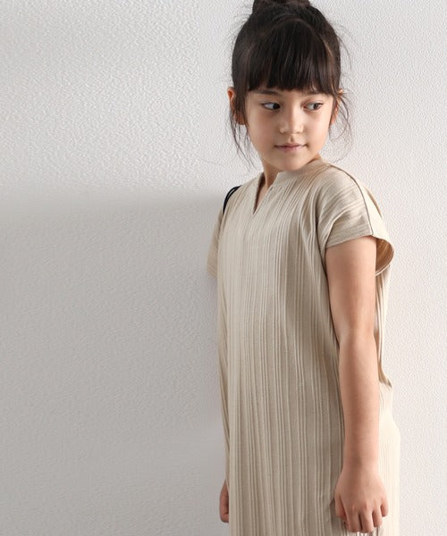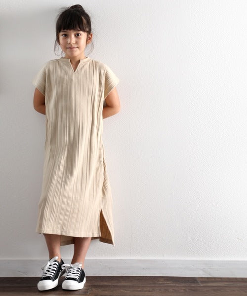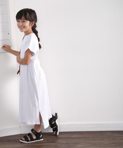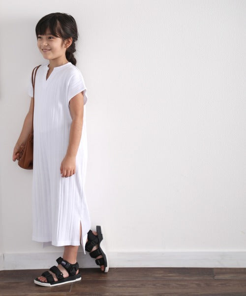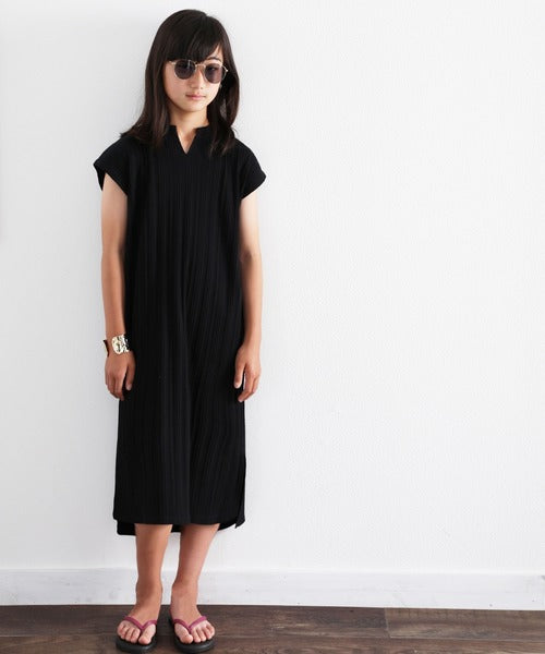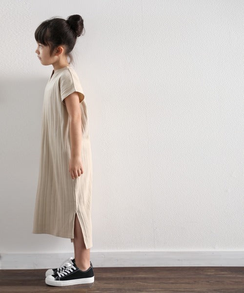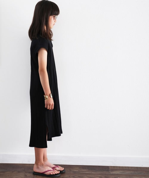 【family+】【親子おそろい】キッズ ランダムリブ フレンチ無地コットンロング丈ワンピース(半袖) kcl7015