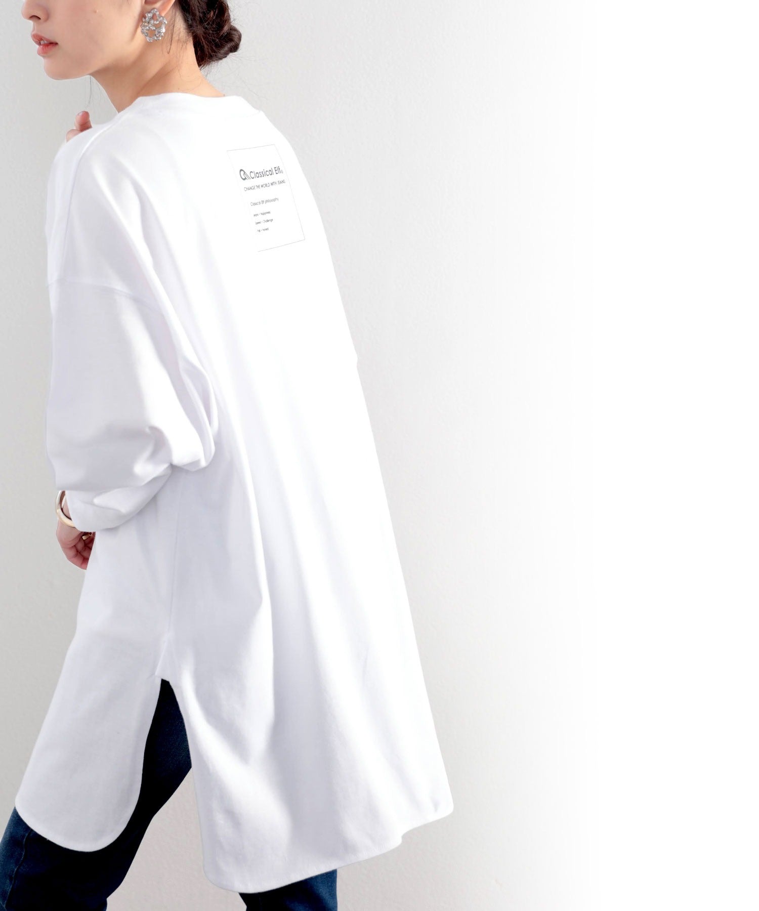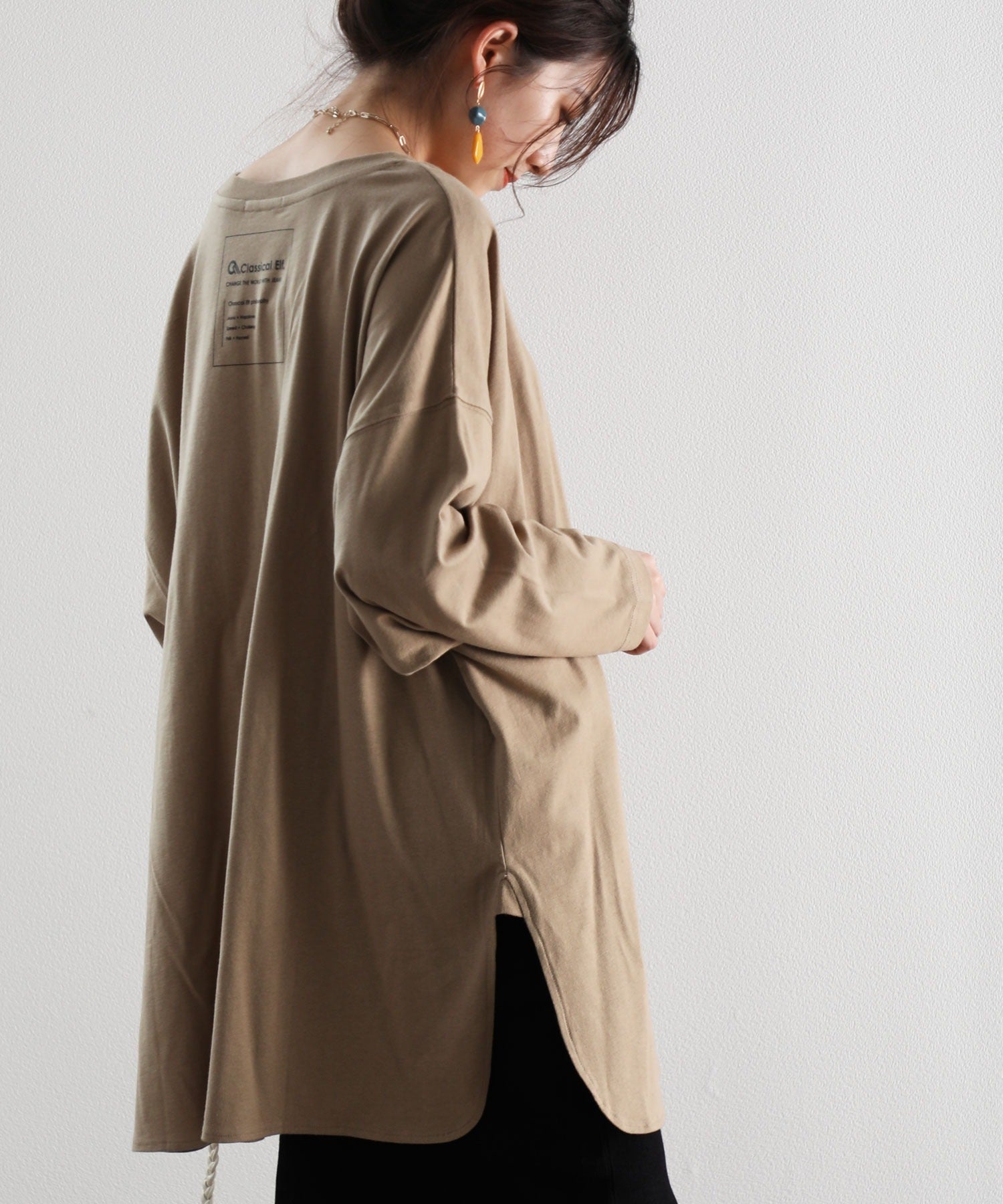 ゆったり着られるサイドスリットがアクセントのビッグシルエットトップス。