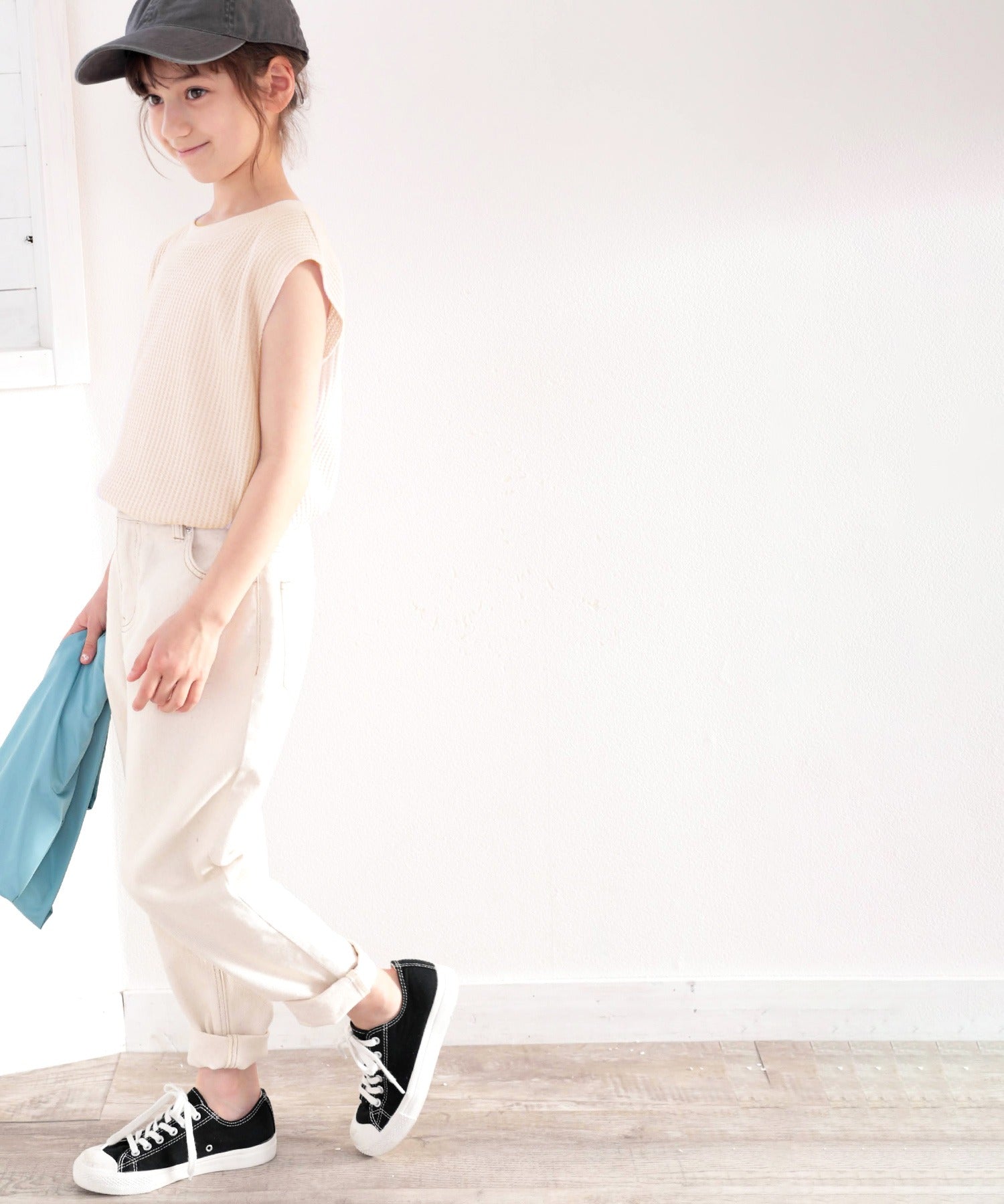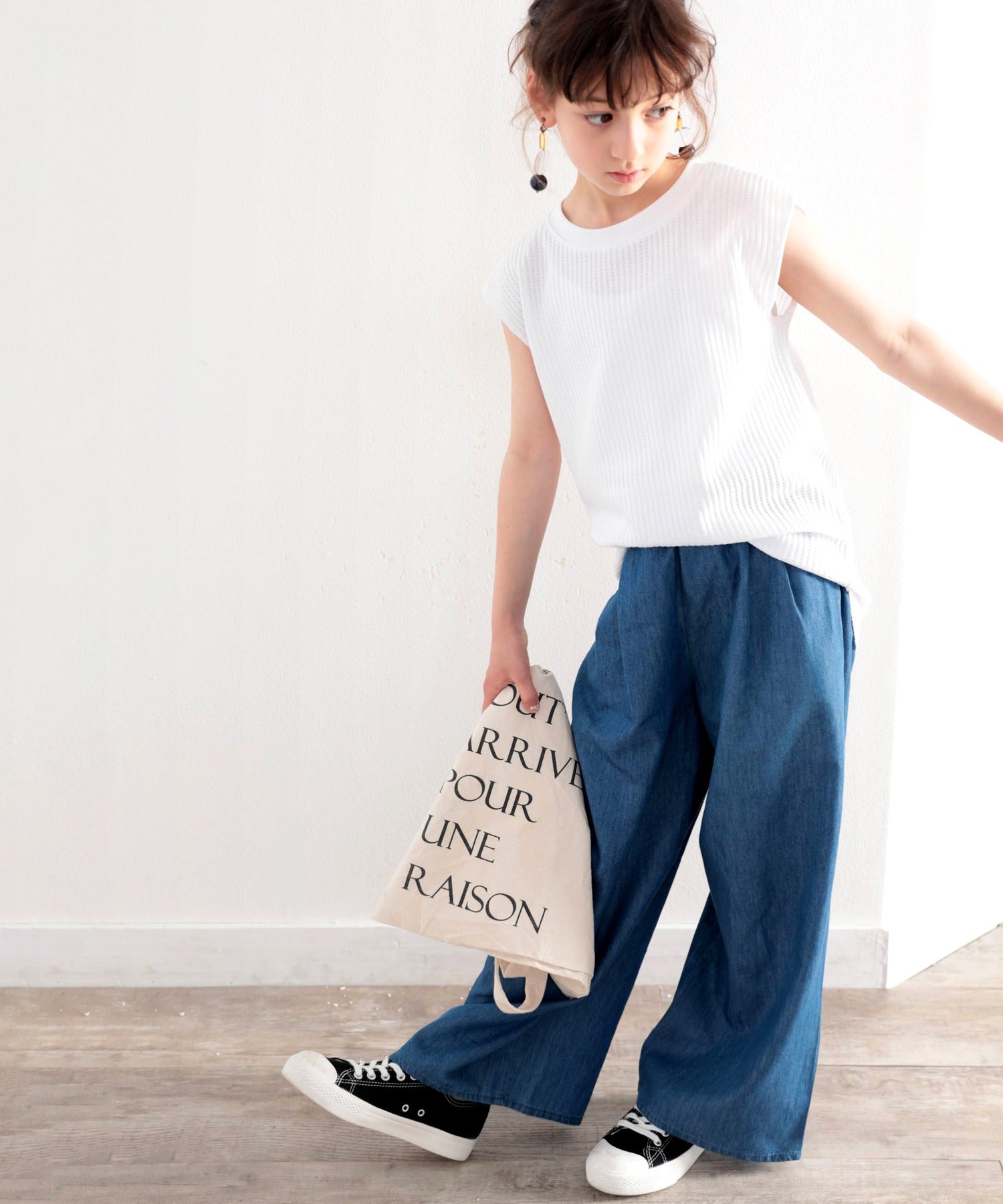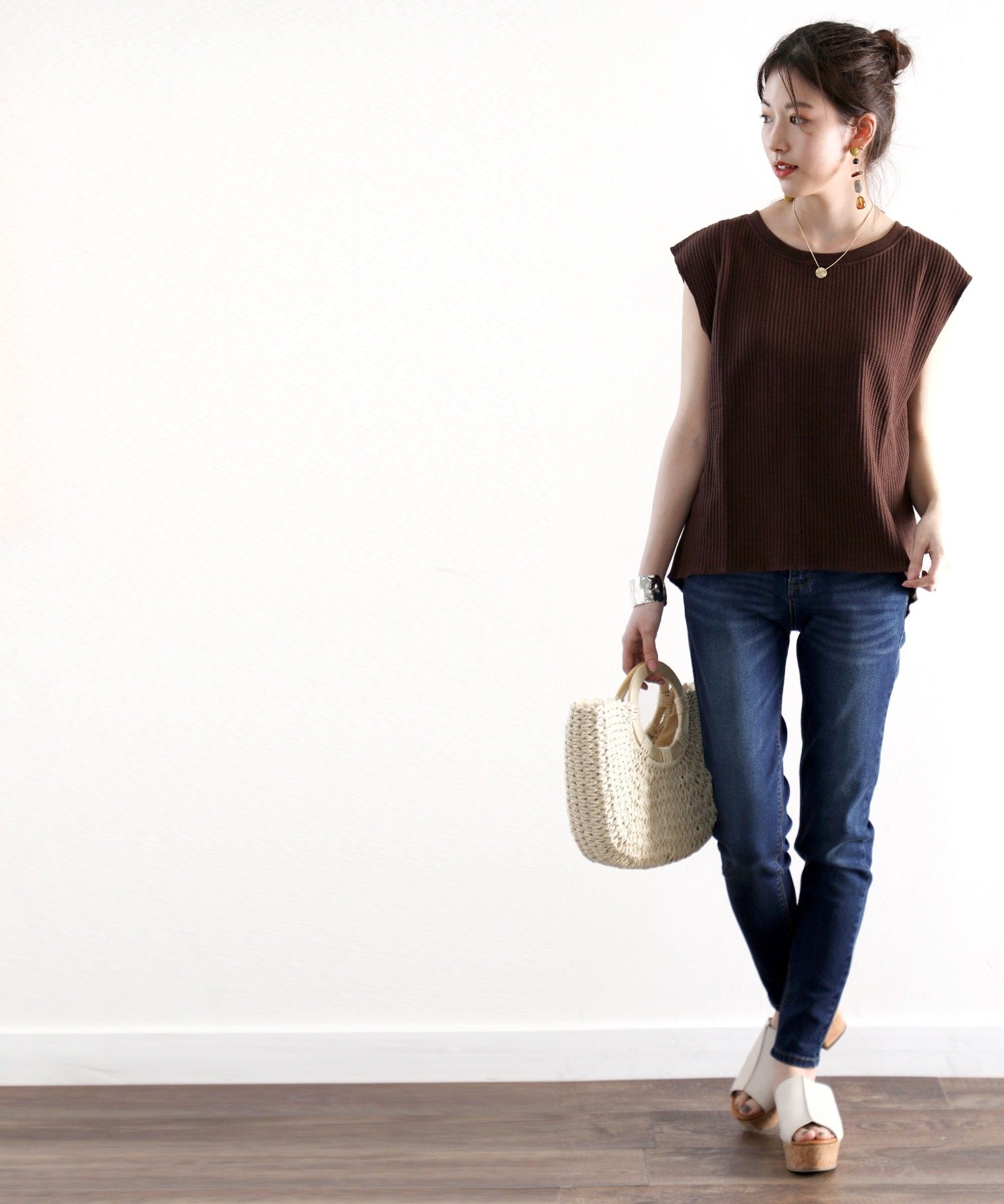 シンプルなトップスなので、どんなボトムスとも相性バッチリ。