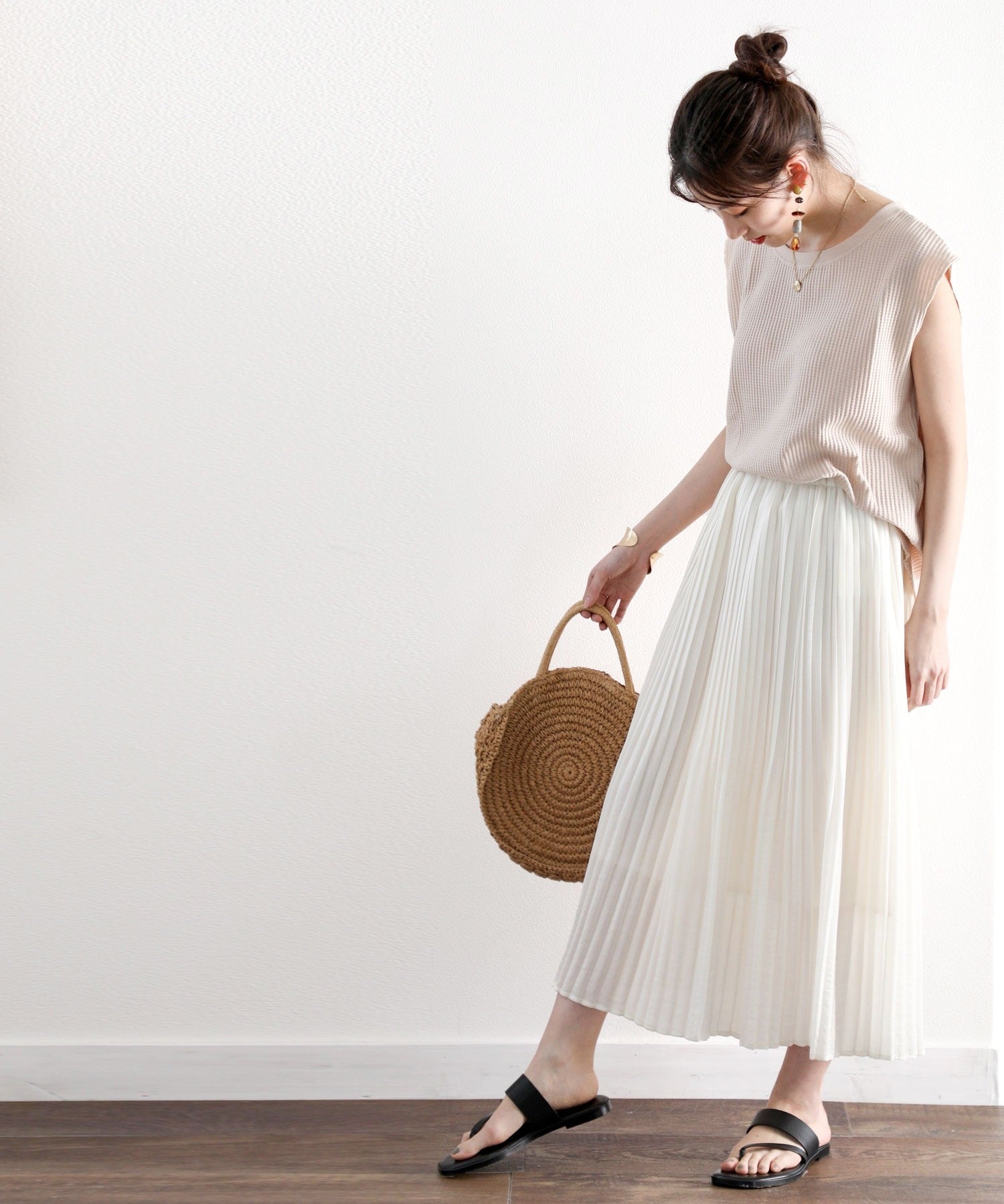 ミニ丈のボトムと合わせて元気な雰囲気にしたり、ふんわりとしたロングスカートにあわせてフェミニン寄りになど