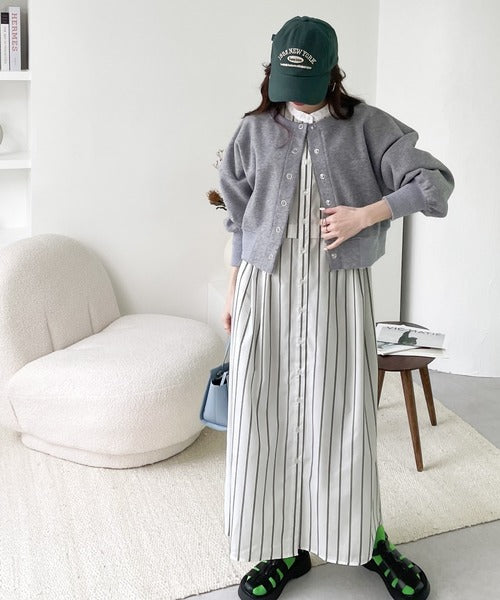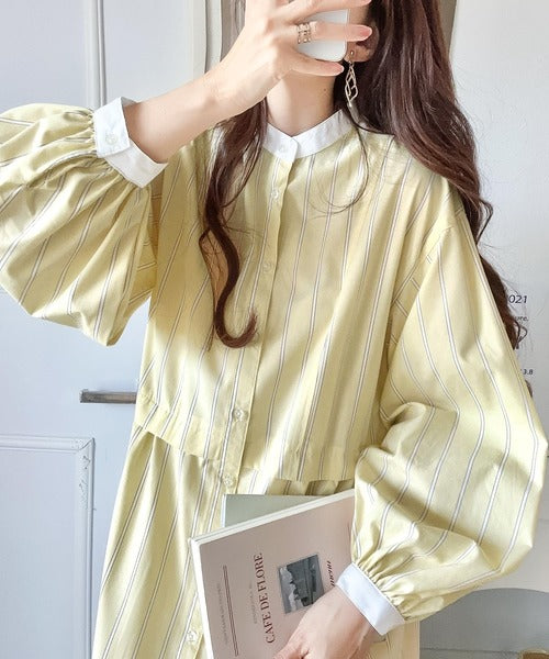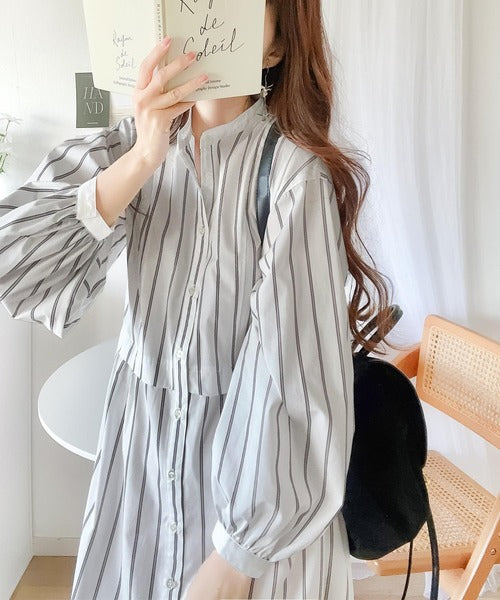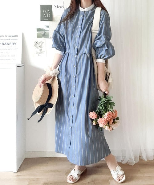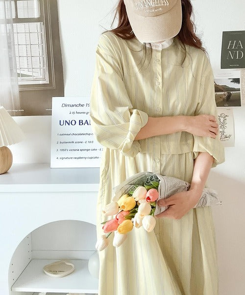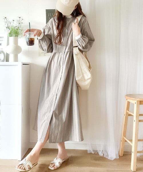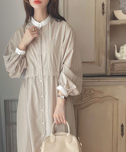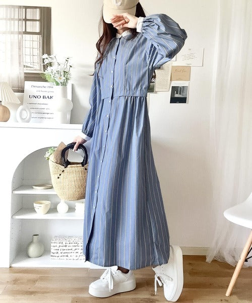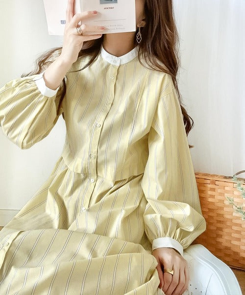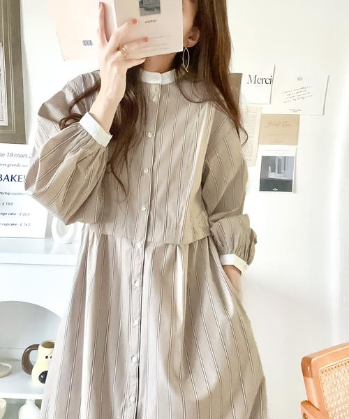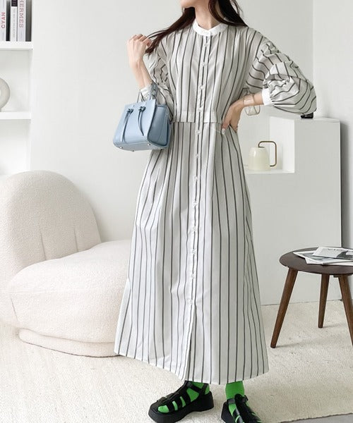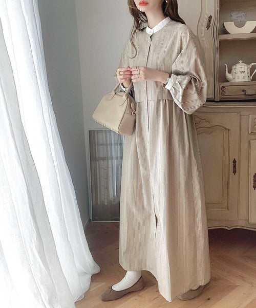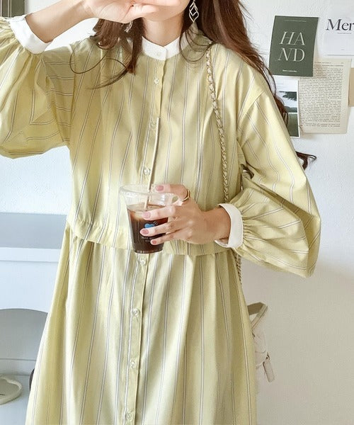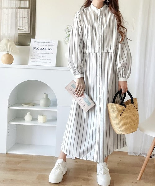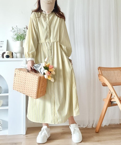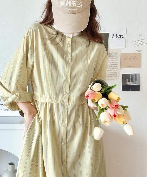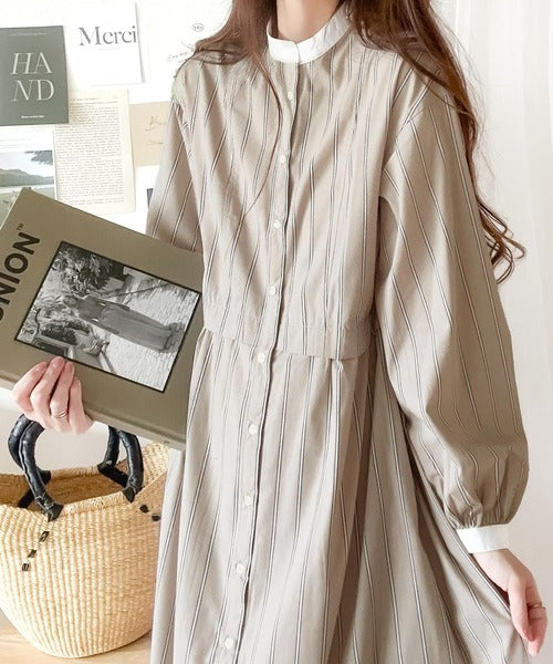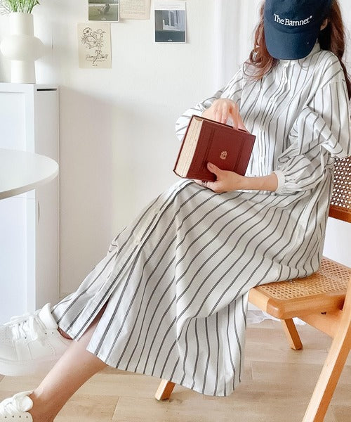 今年トレンドのレトロストライプ柄と切替えデザインを掛け合わせたロングシャツワンピース。