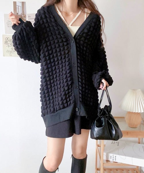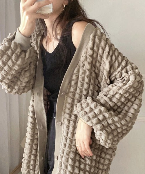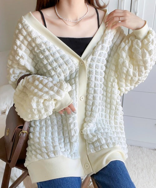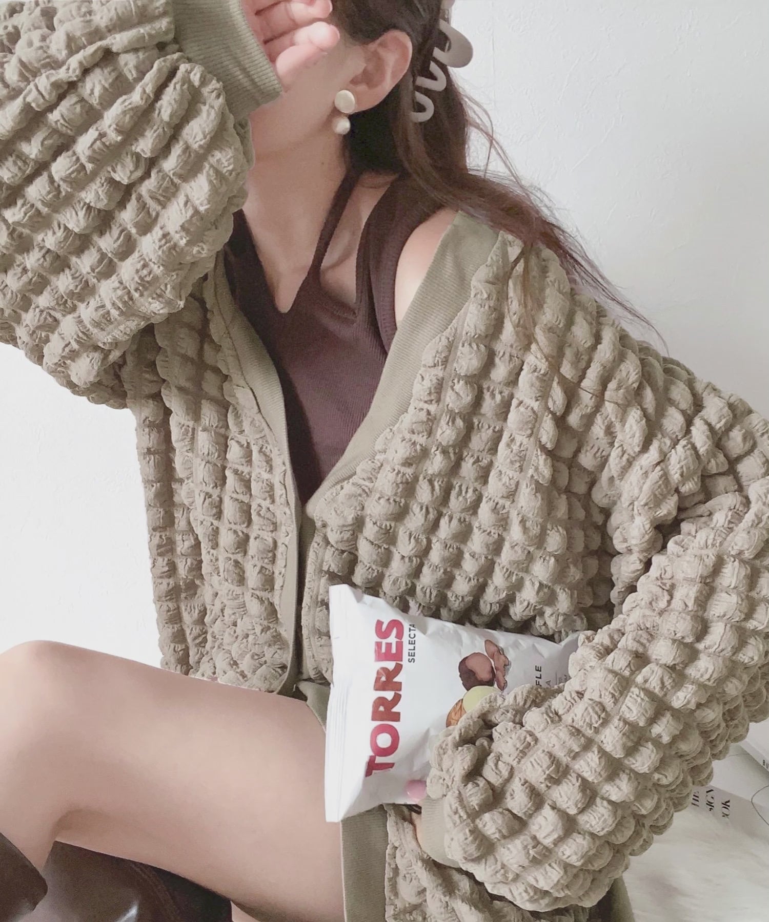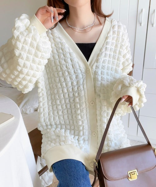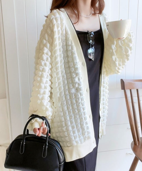 ぽこぽことした風合いが可愛らしい、ゆったりシルエットのカーディガンは