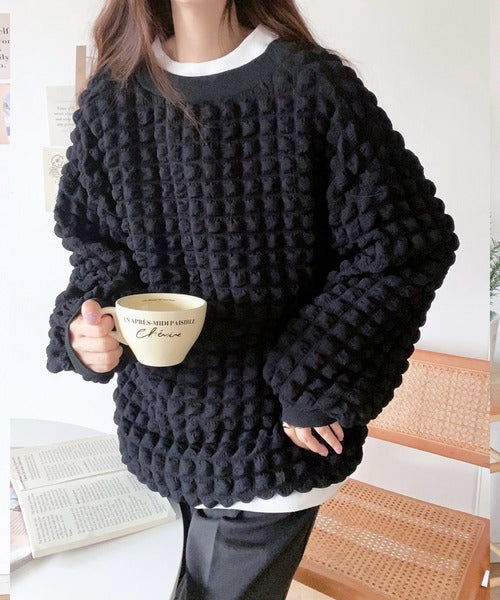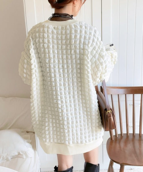 ポップコーンのようなぽこぽことした風合いが魅力的なトップス。