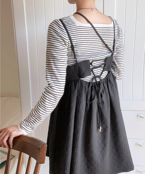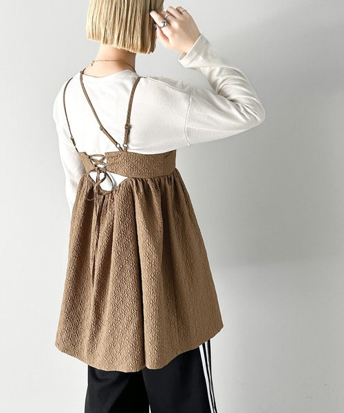 バックレースアップがお洒落ゴコロくすぐる、大人のレイヤードキャミワンピース。