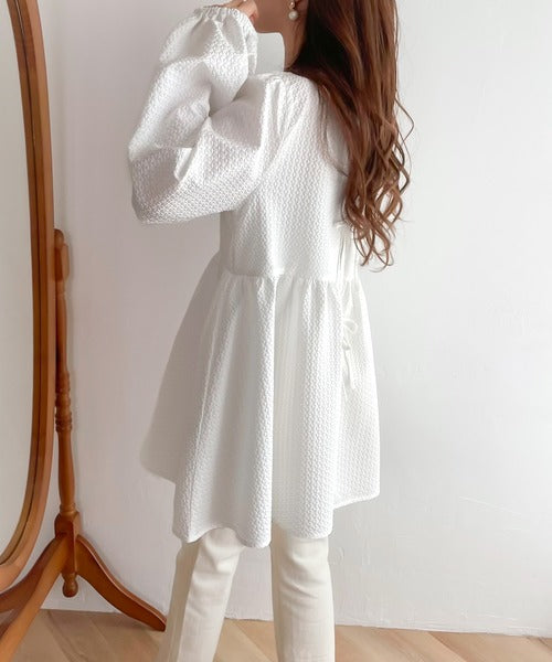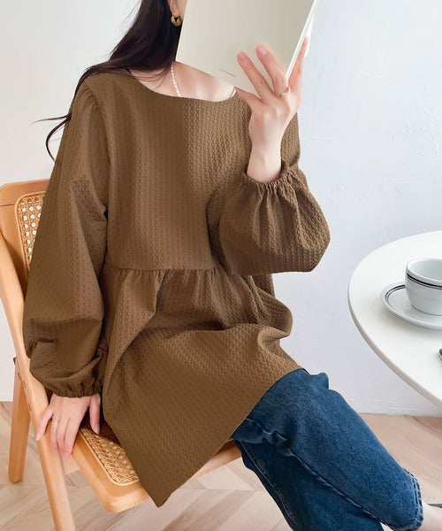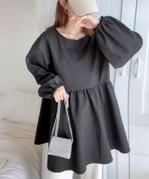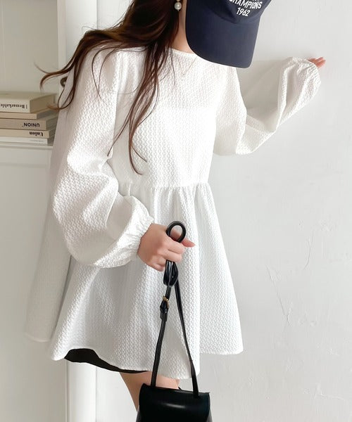 ぽこぽことしたジャガード生地が大人可愛いペプラム型のブラウス。