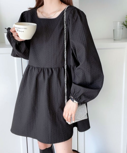 二の腕もカバーできるボリューム袖と高めのウエストの切り替えで脚長効果も期待。