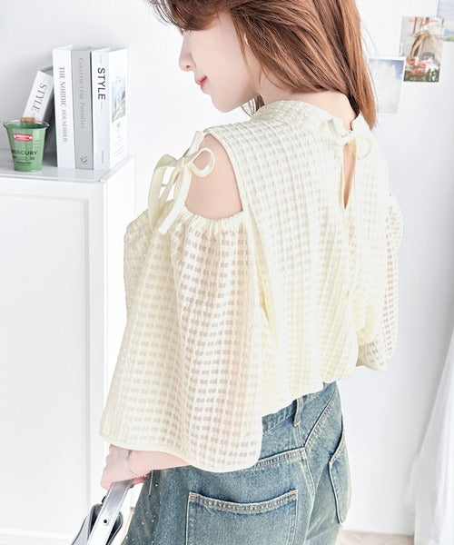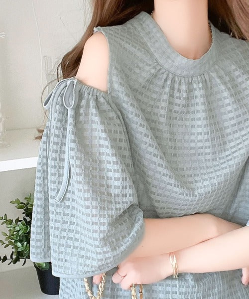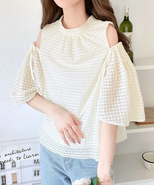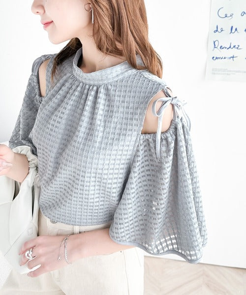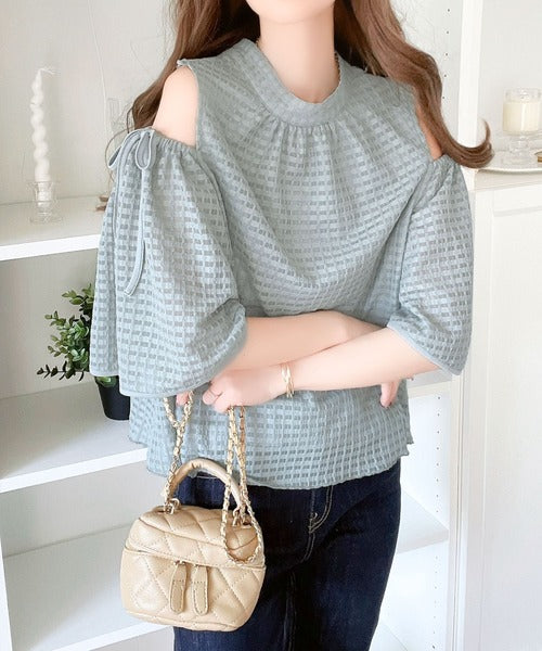 チェック柄のレースが上品で大人可愛い肩開きブラウス。