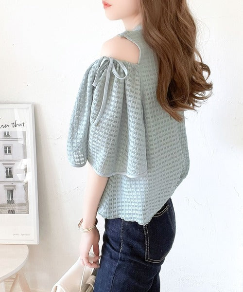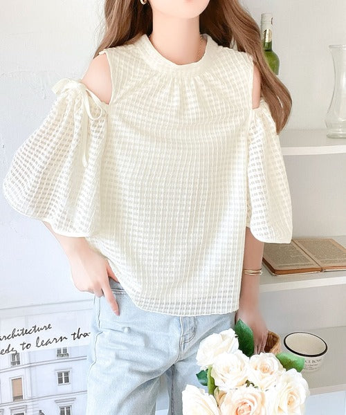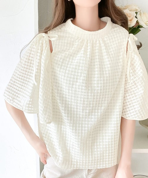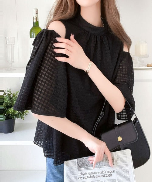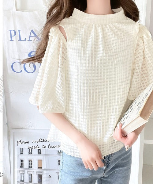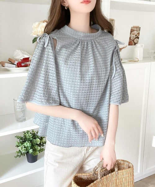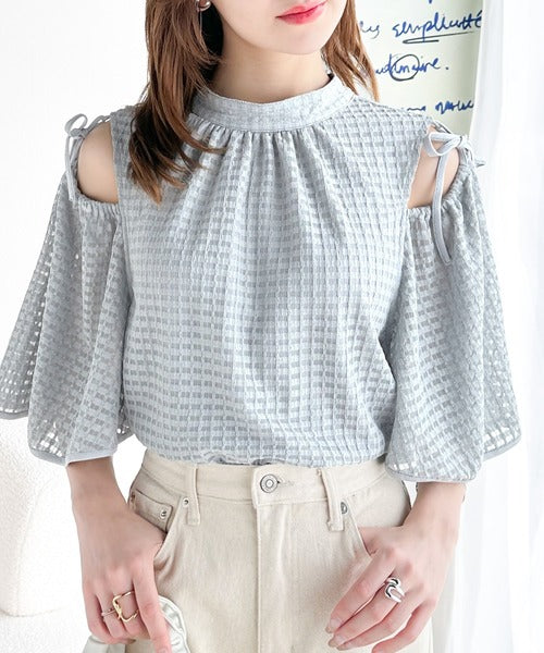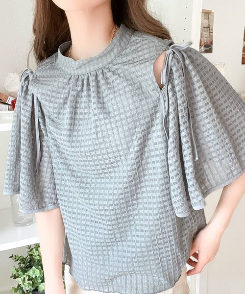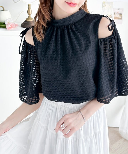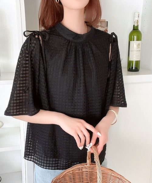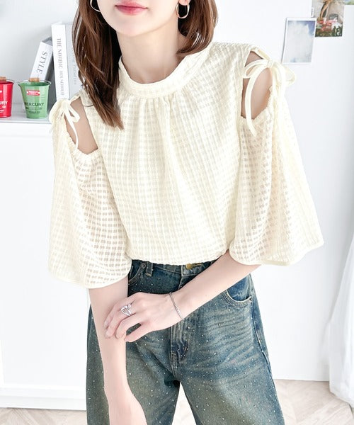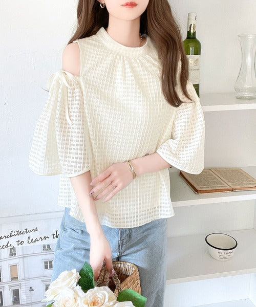 【mily bilet】大人のレトロフェミニン。袖カットアウトデザインリボン付きシアージャガードブラウス mi1019036