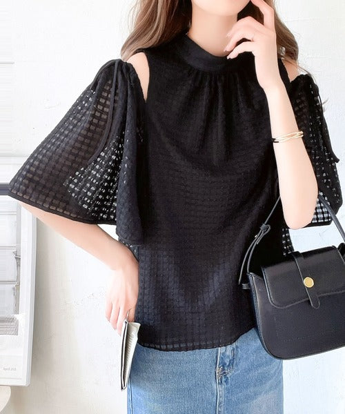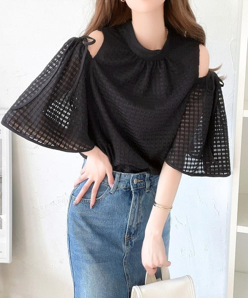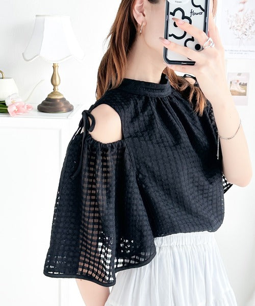 肩山にギャザーを寄せたフレアスリーブ部分は透け感がフェミニン。