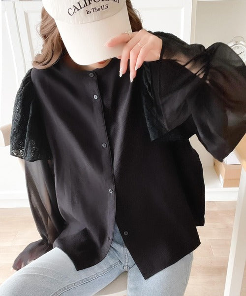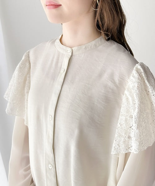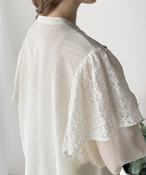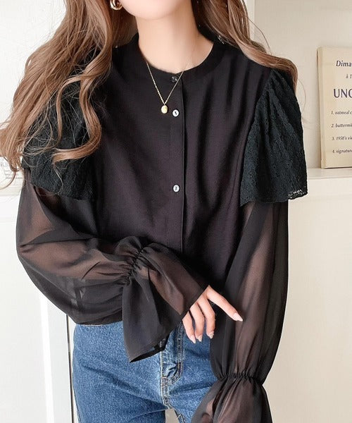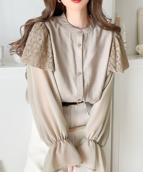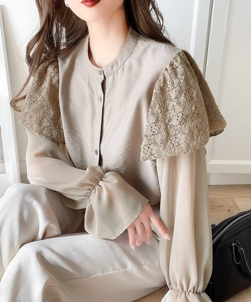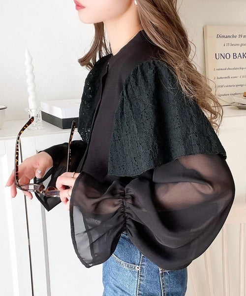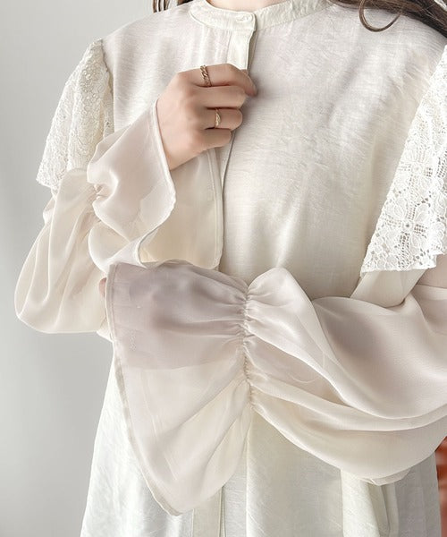 肩にはレース素材を、袖は透け感のあるシフォンをドッキングさせた、