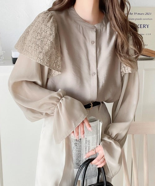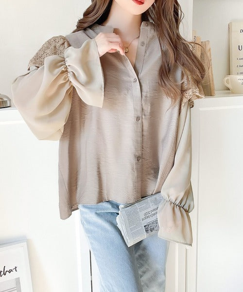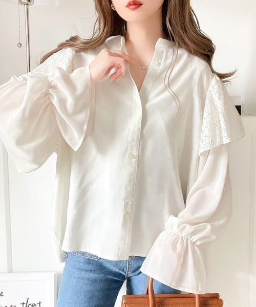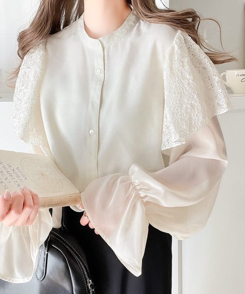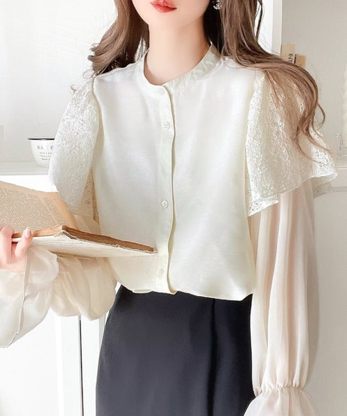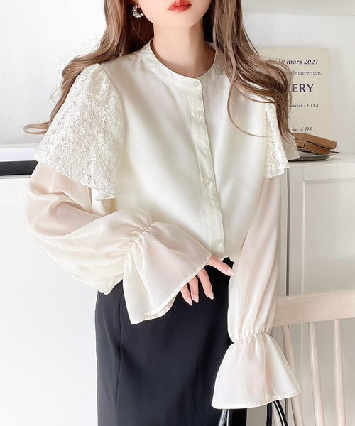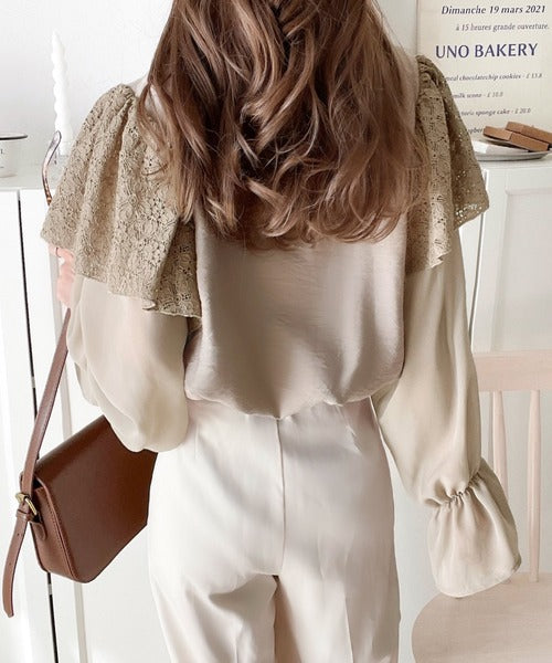 トレンドのレースと異素材をミックスさせた上品なブラウス。