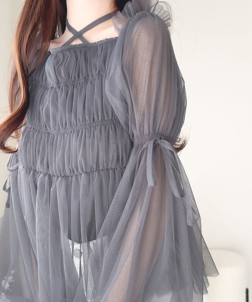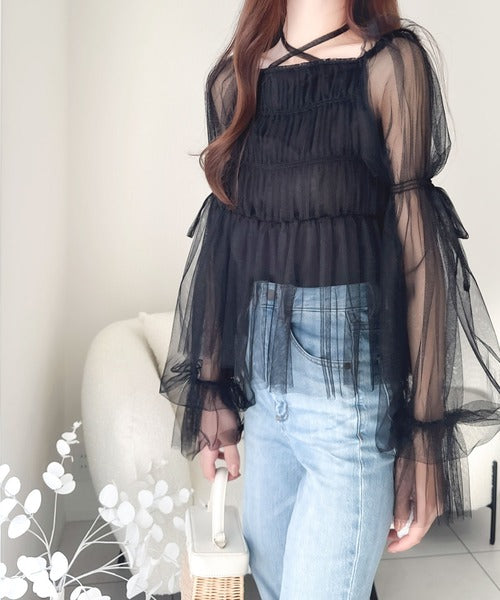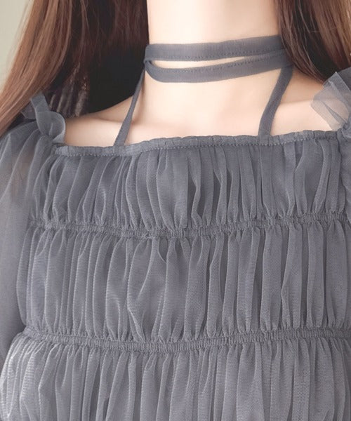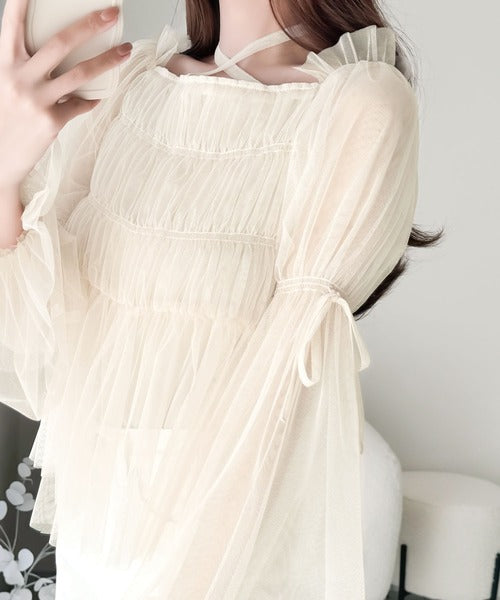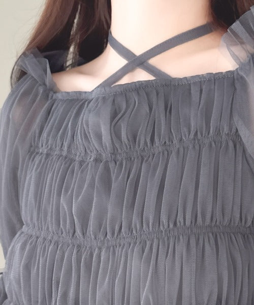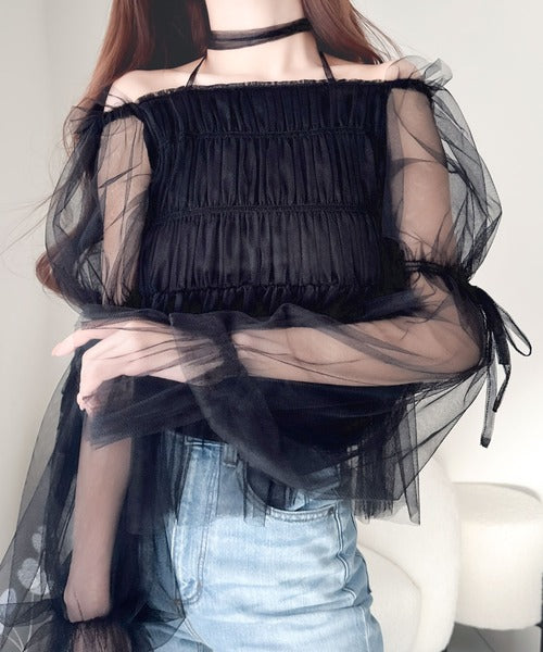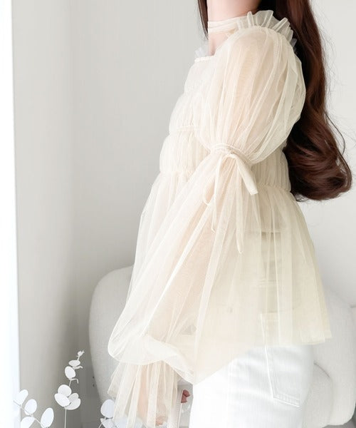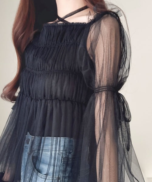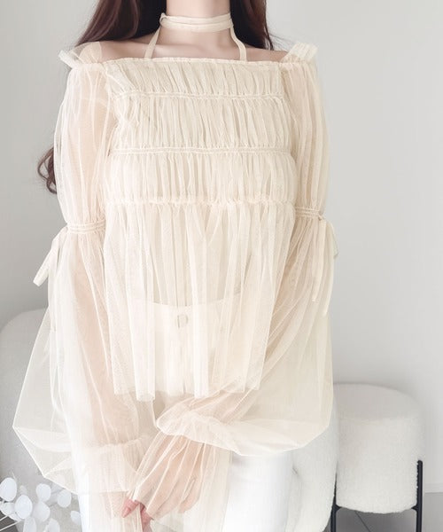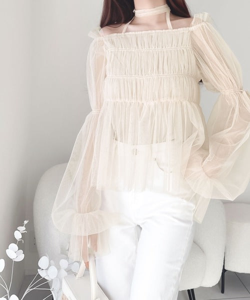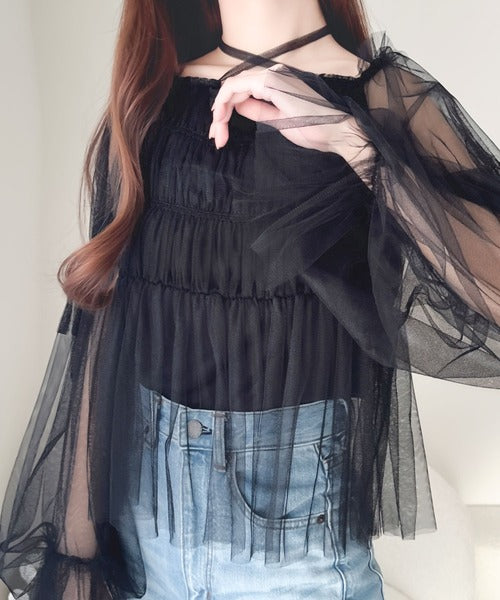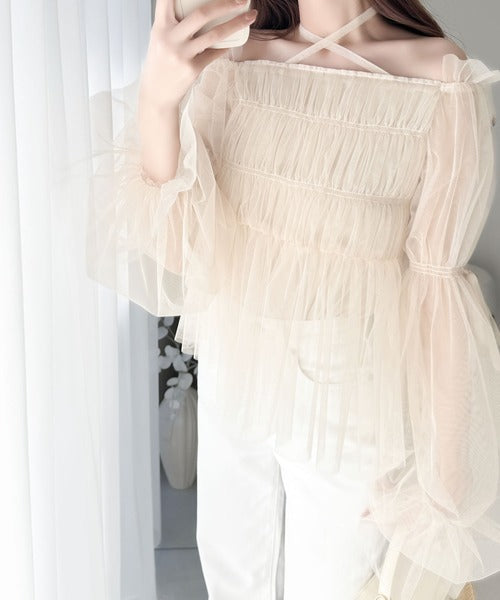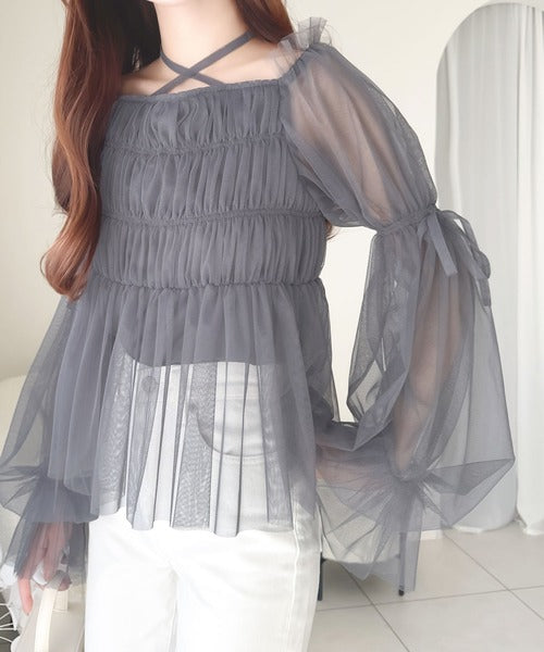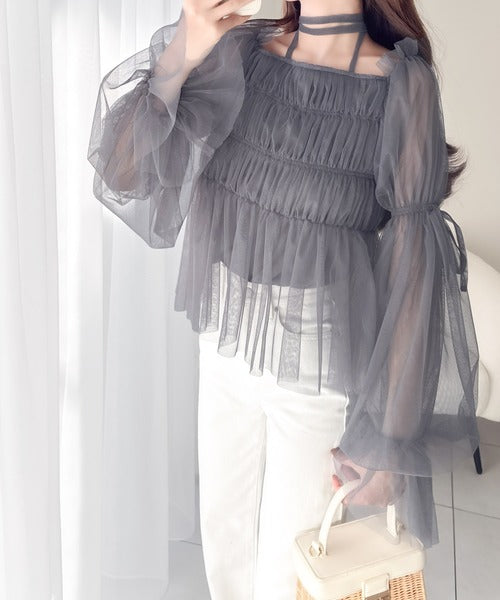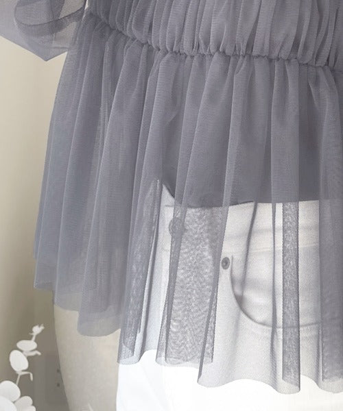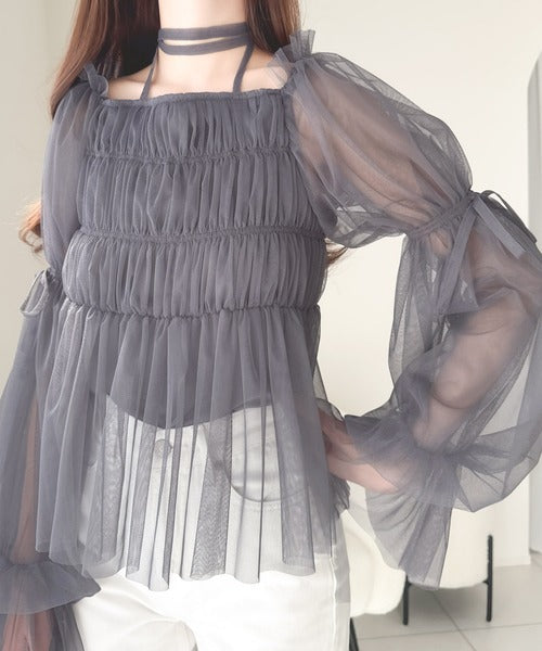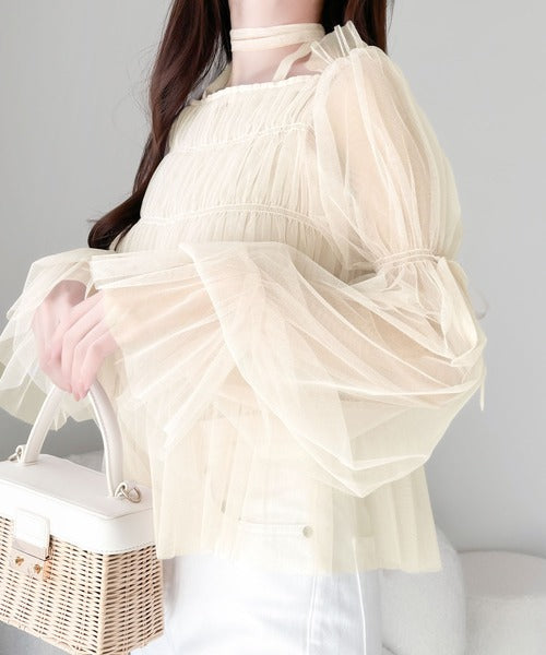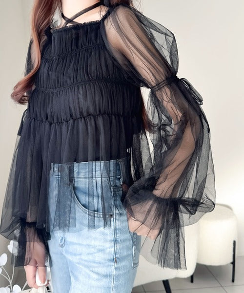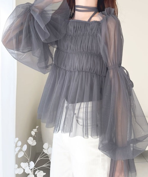 ギャザー・シャーリングをふんだんにあしらったトレンド感満載のチュールブラウス。