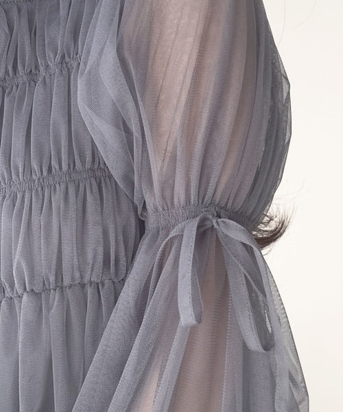 【mily bilet】自由自在な着こなしが楽しめる。リボン使い2WAYボリュームスリーブチュールオフショルブラウス mi1019041