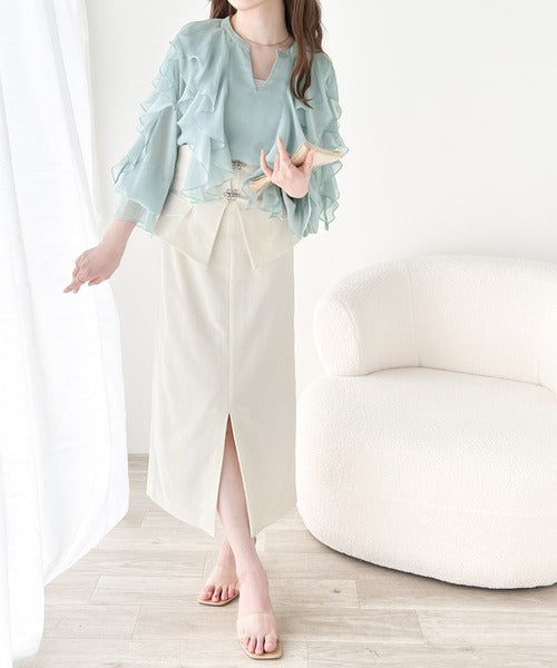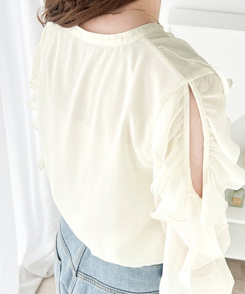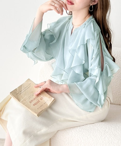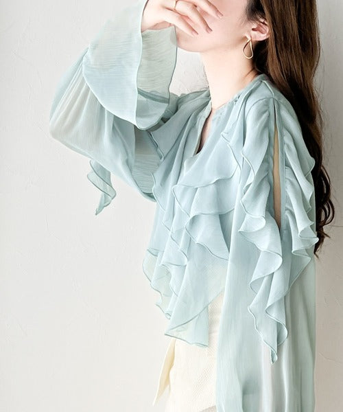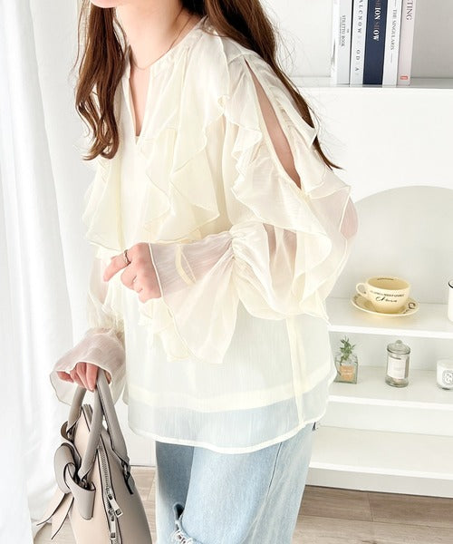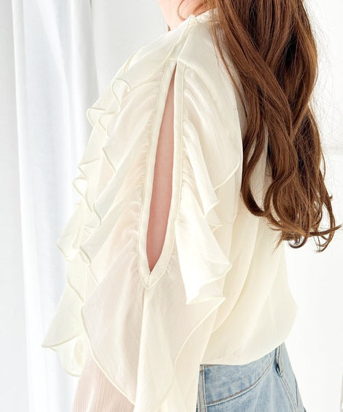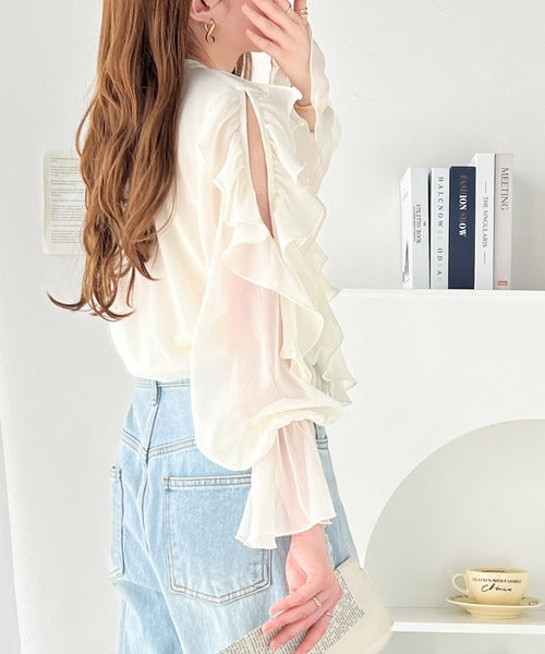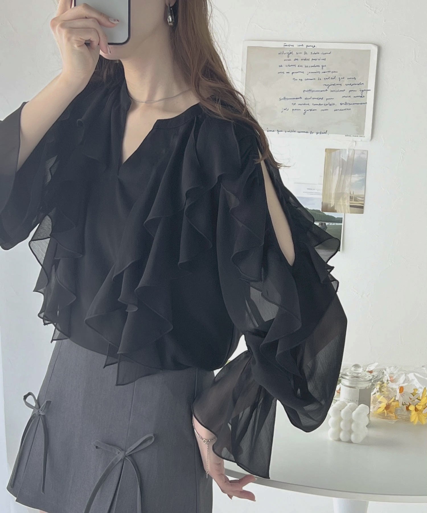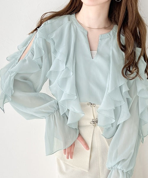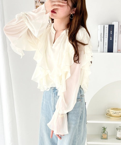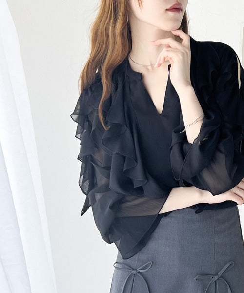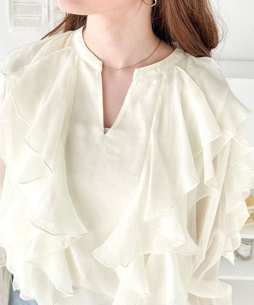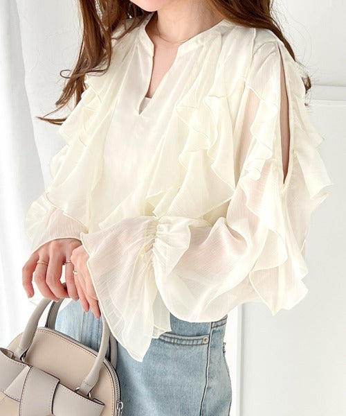 身頃・袖のボリューム感あるフリルディテールが目を惹くブラウス。