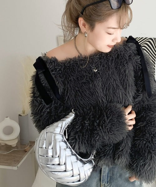 オフショルダー2WAYデザインのファートップス。