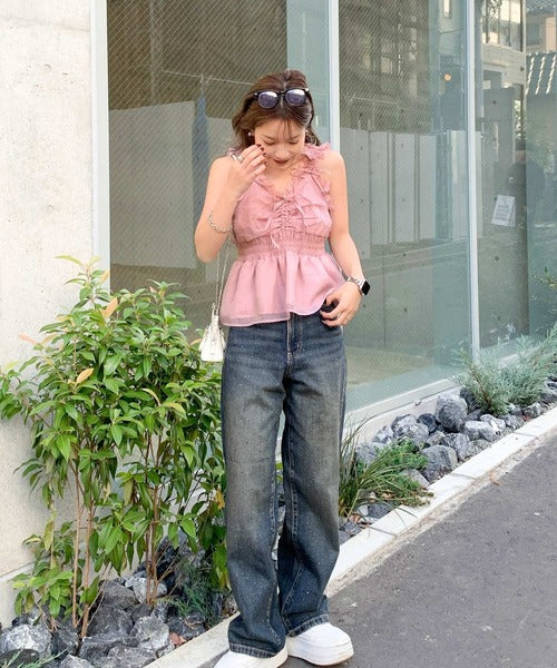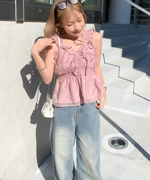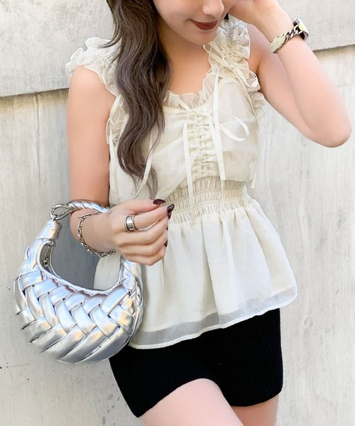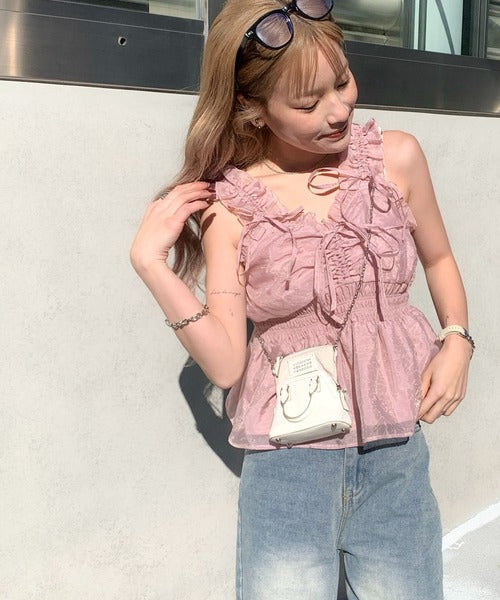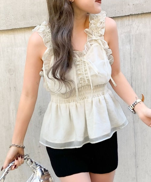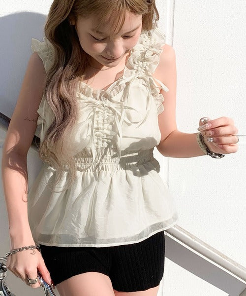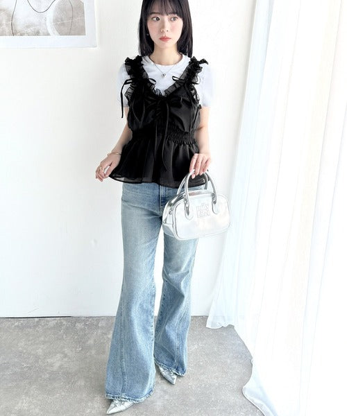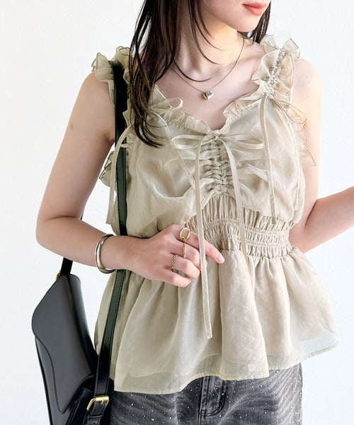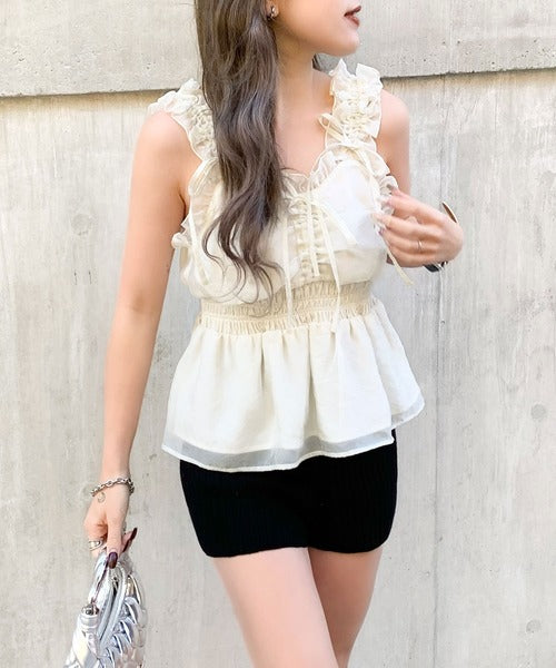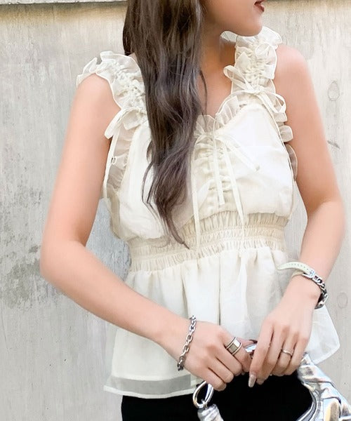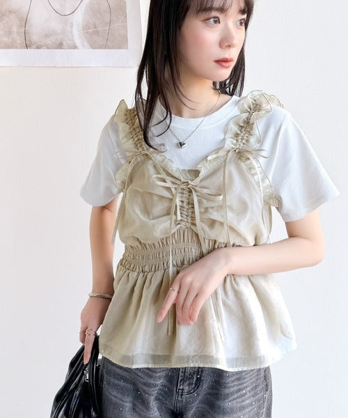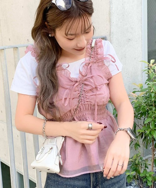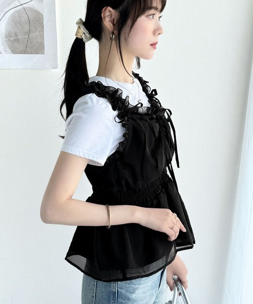フリル・リボン・シャーリングと、ガーリーデティールが詰まったオーガンジービスチェ。