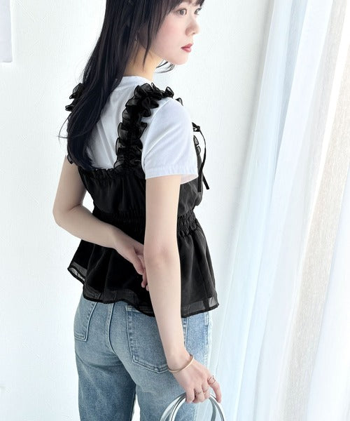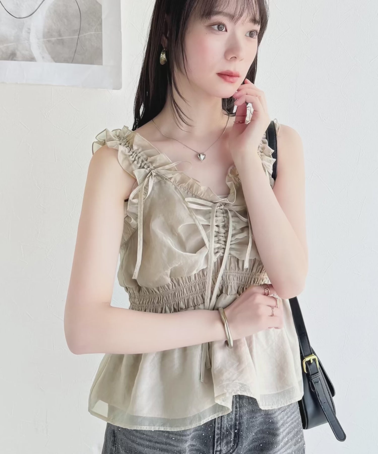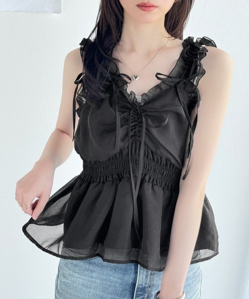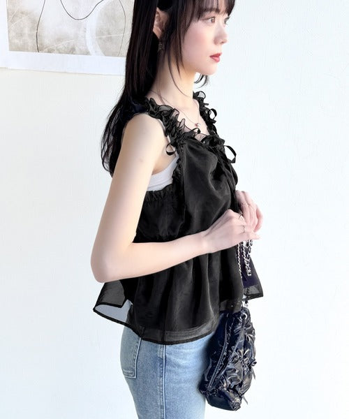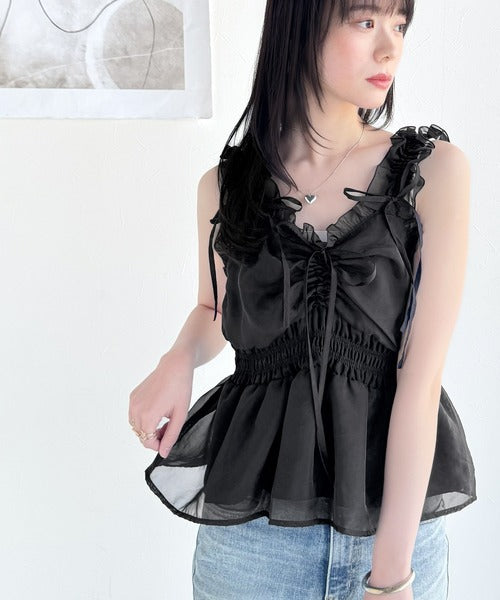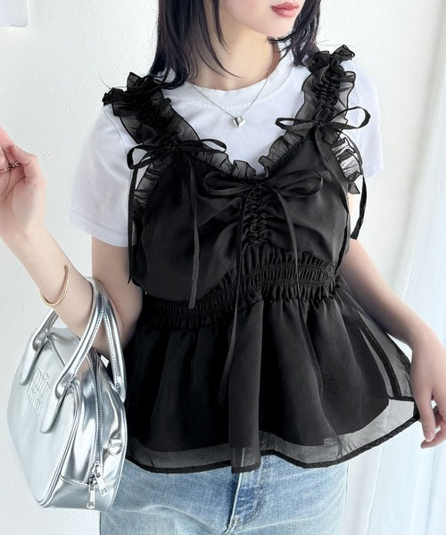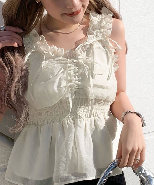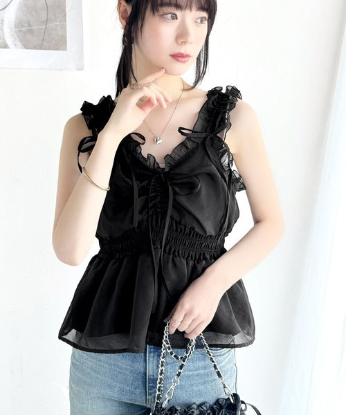 【mily bilet】愛され大人フェミニン。リボン使いフリルオーガンジービスチェキャミソール mi1019072