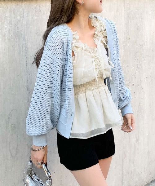 軽やかなオーガンジー素材が動くたびに揺れ、フェミニンな印象を与えます。