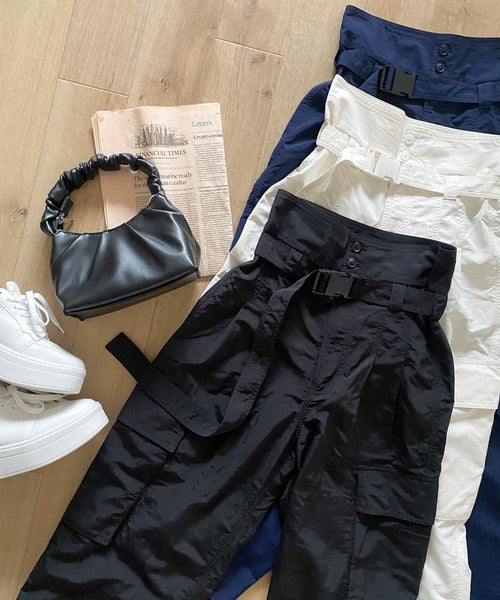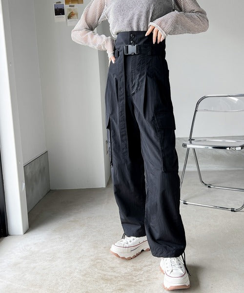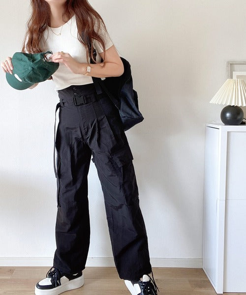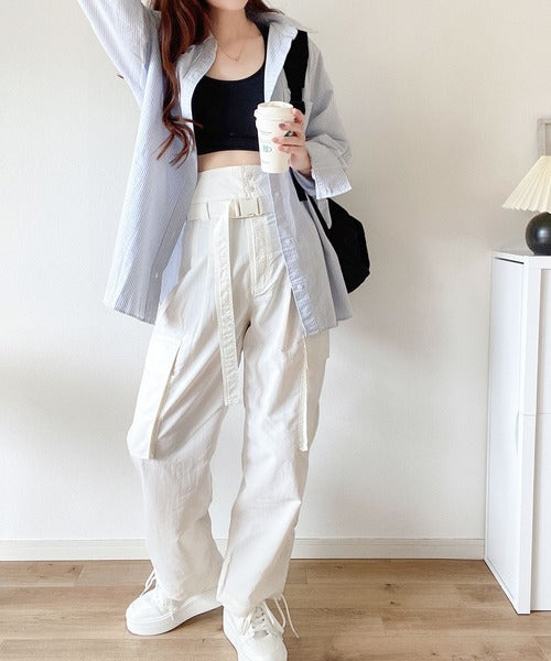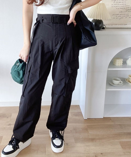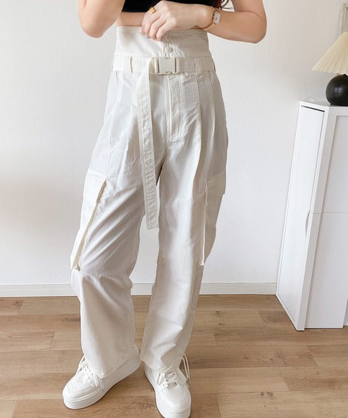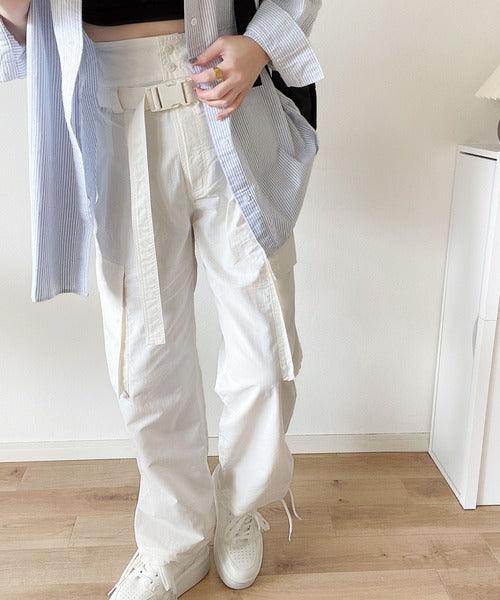 トレンドカーゴパンツデザインにウェービングベルトがアクセント◎