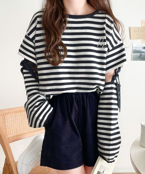 大人カジュアルに外せないボーダーアイテムをリボンとスリットでフェミニンにアレンジ。
