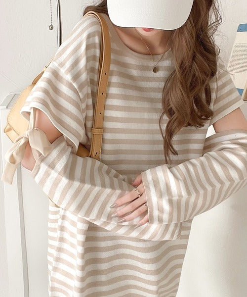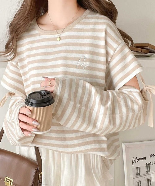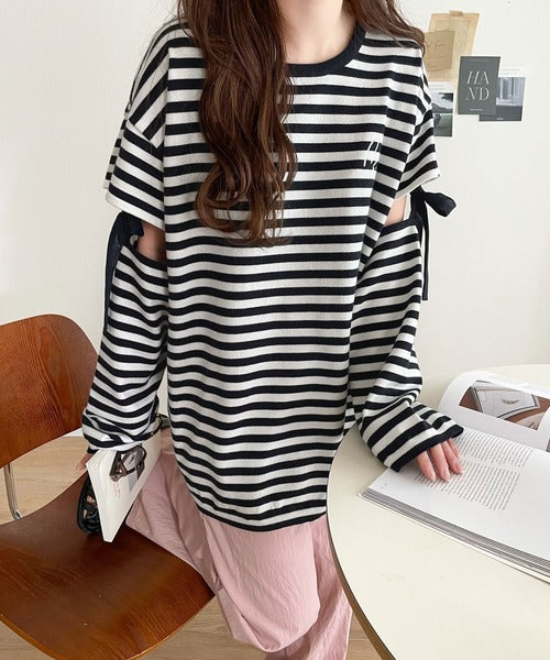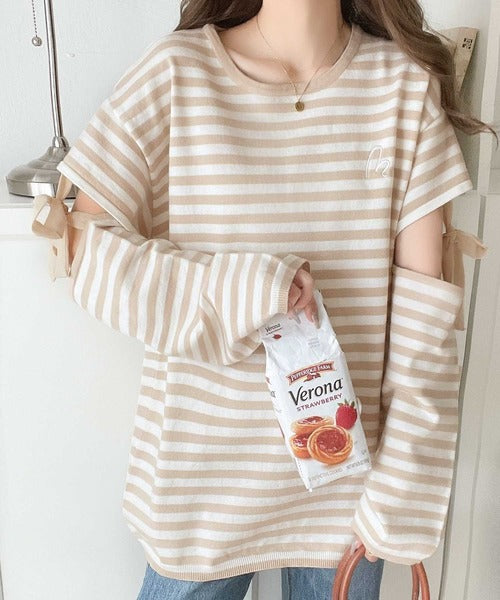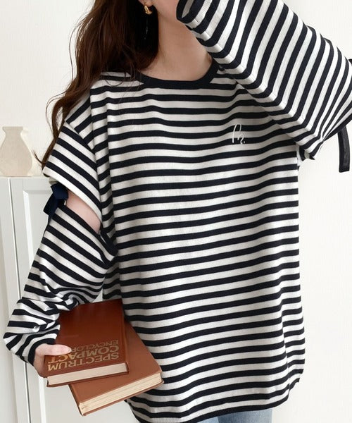 シフォンリボンとスリット入りの袖がポイントのボーダーニット。