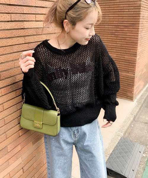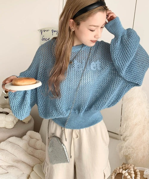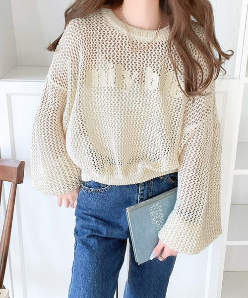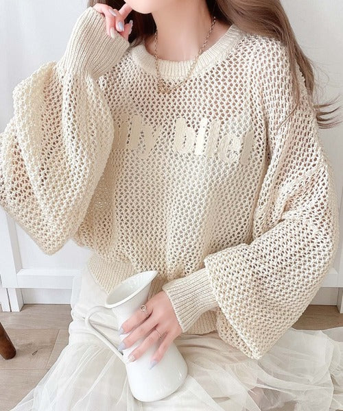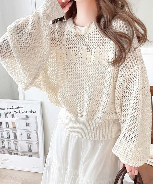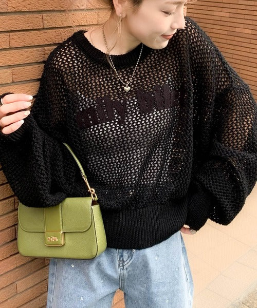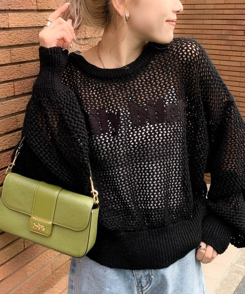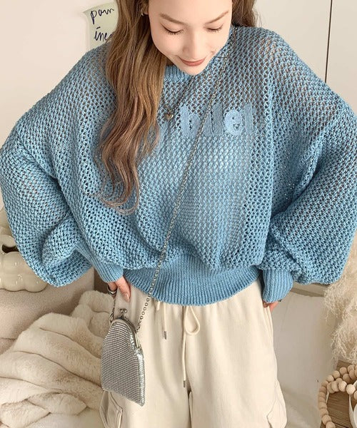 ざっくりしたメッシュニットにロゴ刺繍でトレンドライクなデザイン。