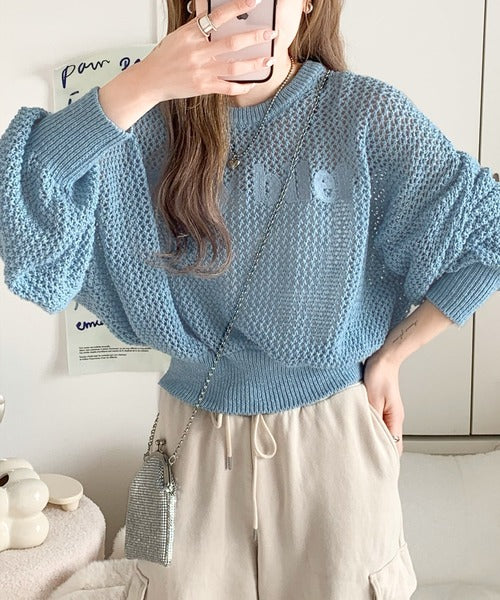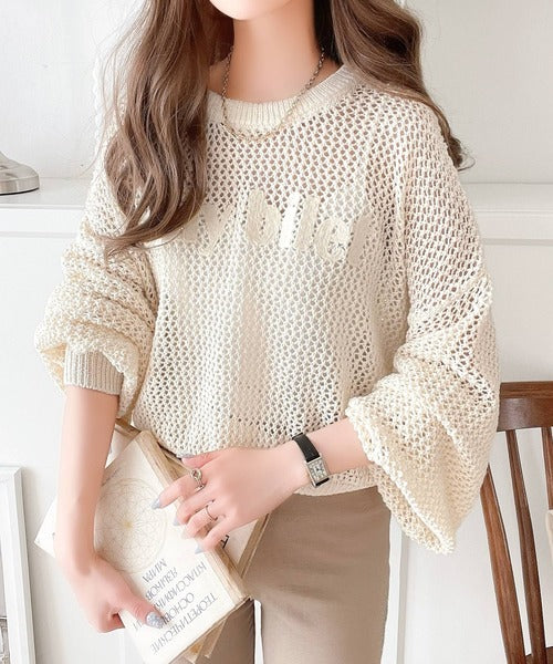 胸にロゴ刺繍入りのざっくりメッシュのニットプルオーバー。