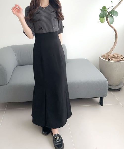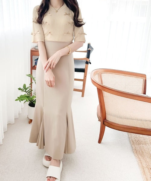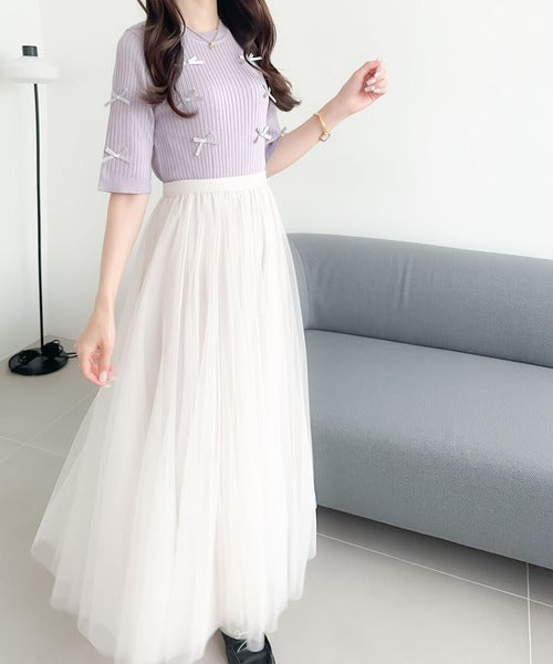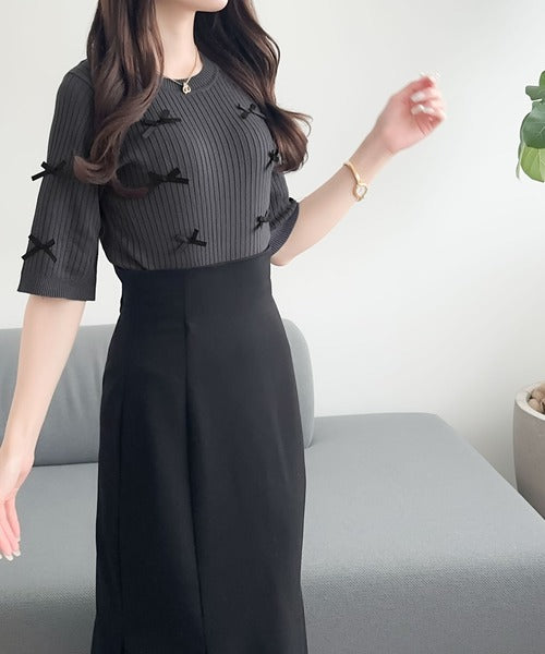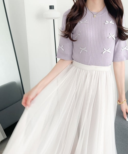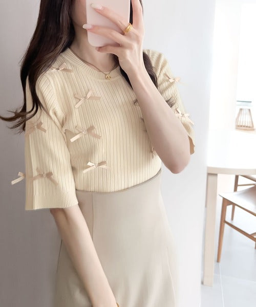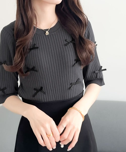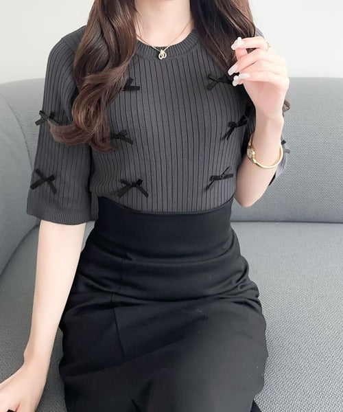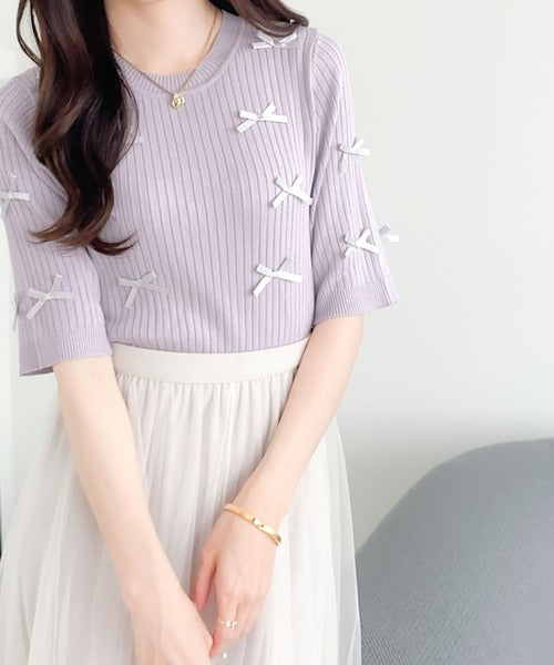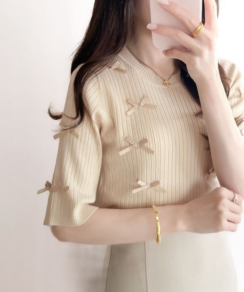 綺麗めな雰囲気のリブニットに立体的なミニリボンを